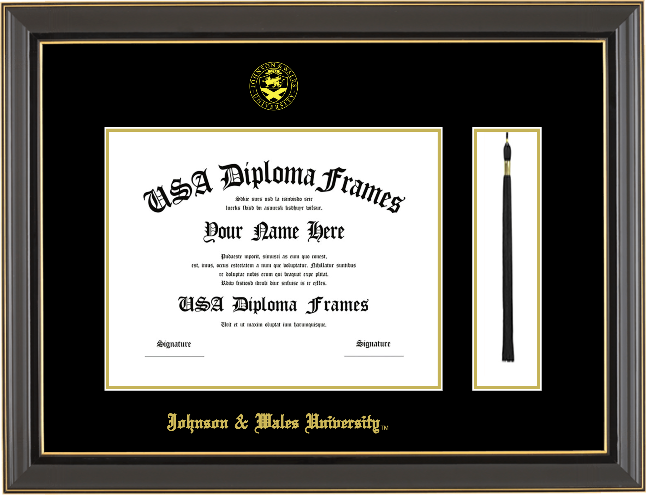 Johnson & Wales University – Single Horizontal Document ( Bachelors ) – Black Gold Trim Glossy – Black Mat – Gold Accent Mat – With Tassel(Default) – With Seal(University Seal Gold) – With Gold Embossing (Johnson & Wales University)