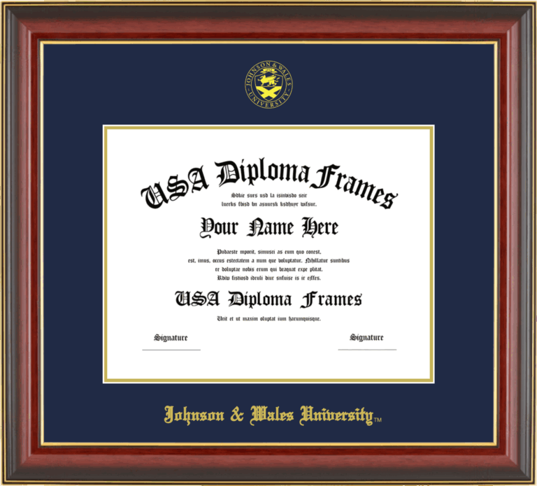 Johnson & Wales University Diploma Frame – – Cherry Mahogany Gold Trim Glossy – Navy and Gold Mat