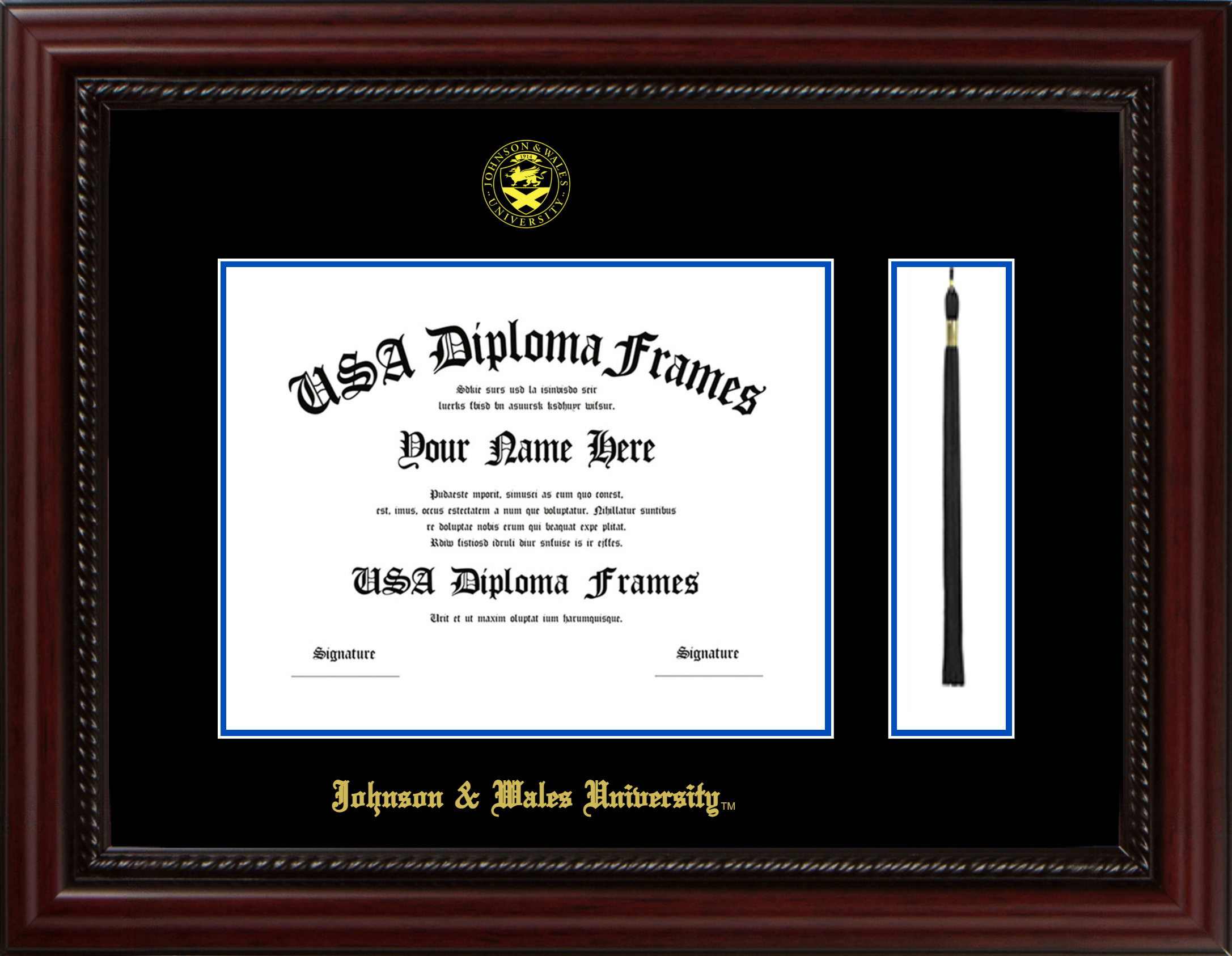 Johnson & Wales University – Single Horizontal Document ( Bachelors ) – Executive Cherry Rope – Black Mat – Royal Blue Accent Mat – With Tassel(Default) – With Seal(University Seal Gold) – With Gold Embossing (Johnson & Wales University)