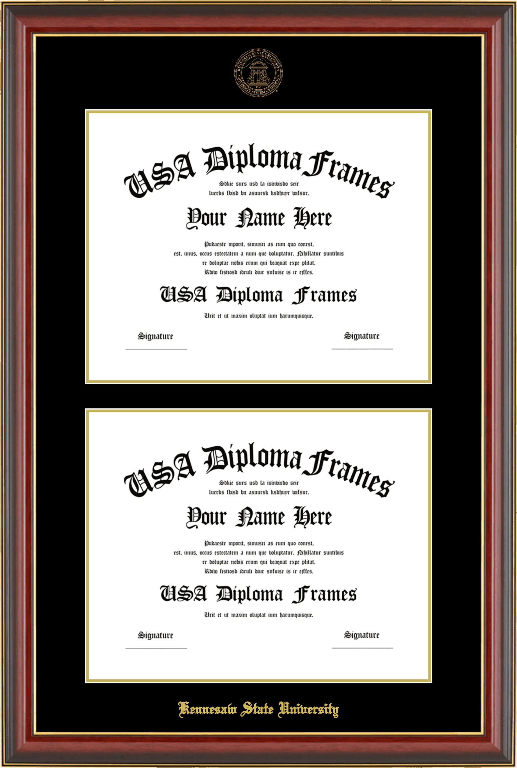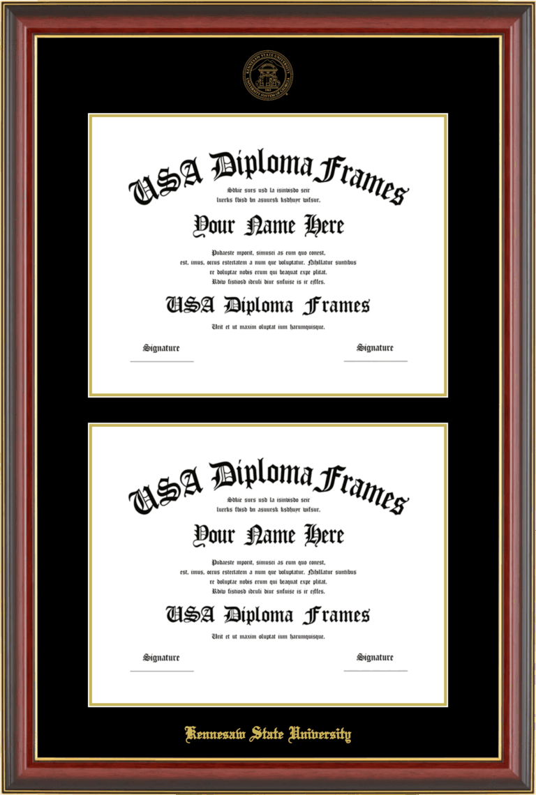 Kennesaw State University Double Diploma Frame – Double Document – Cherry Mahogany Gold Trim Glossy – Black and Gold Mat