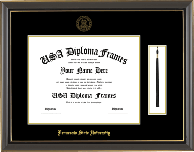 Kennesaw State University – Single Horizontal Document ( Bachelors ) – Black Gold Trim Glossy – Black Mat – Gold Accent Mat – With Tassel(Default) – With Seal(University Seal Gold) – With Gold Embossing (Kennesaw State University)