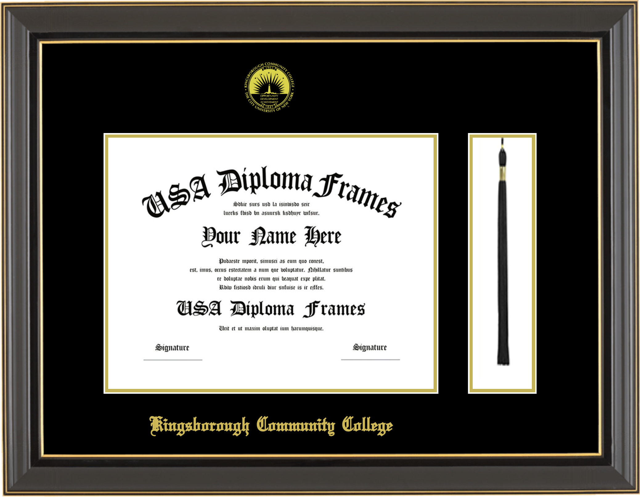 Kingsborough College Diploma Frame with Tassel – Black Gold Trim Glossy – Black and Gold Mat