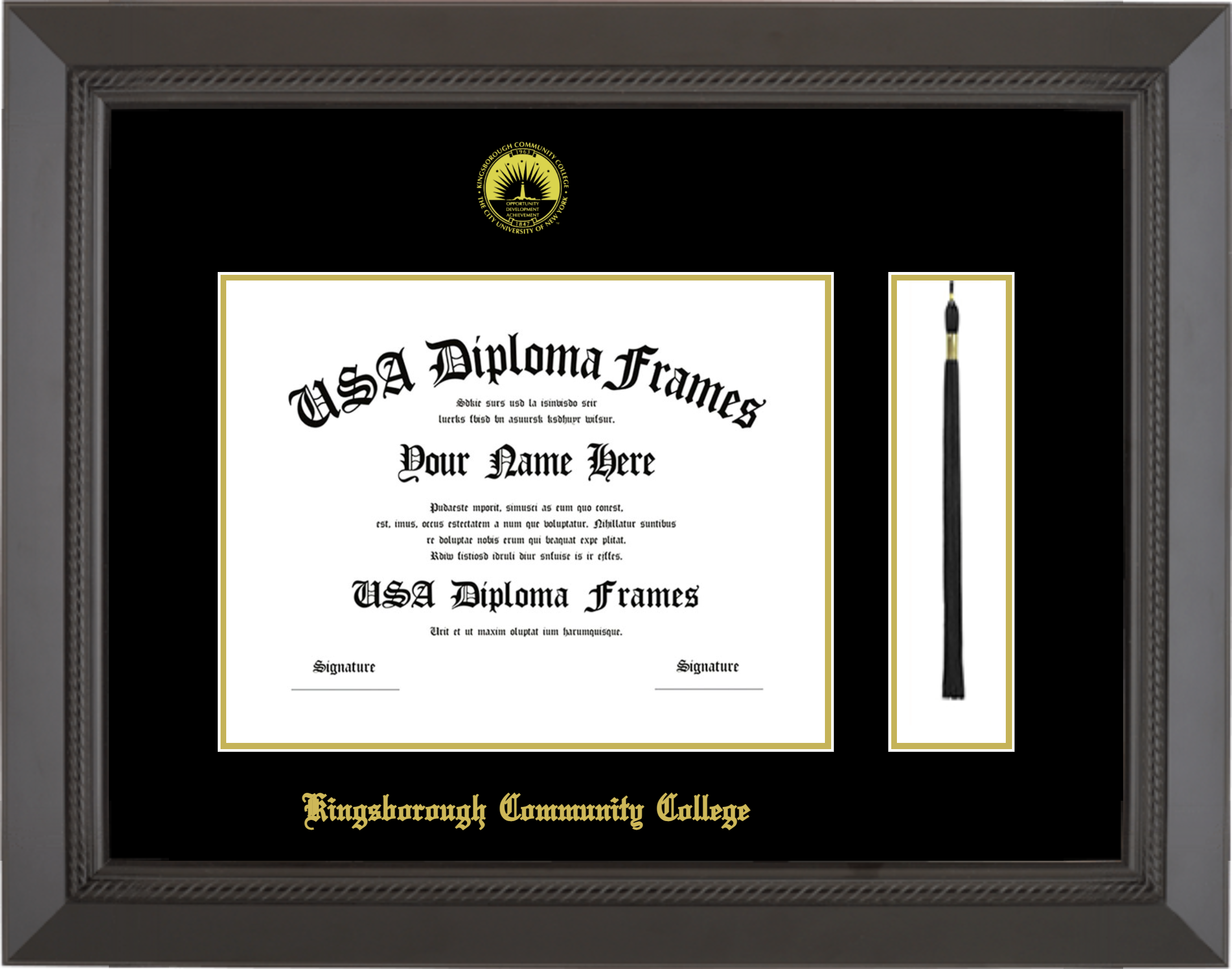 Kingsborough College Diploma Frame with Tassel – Black Rope – Black and Gold Mat