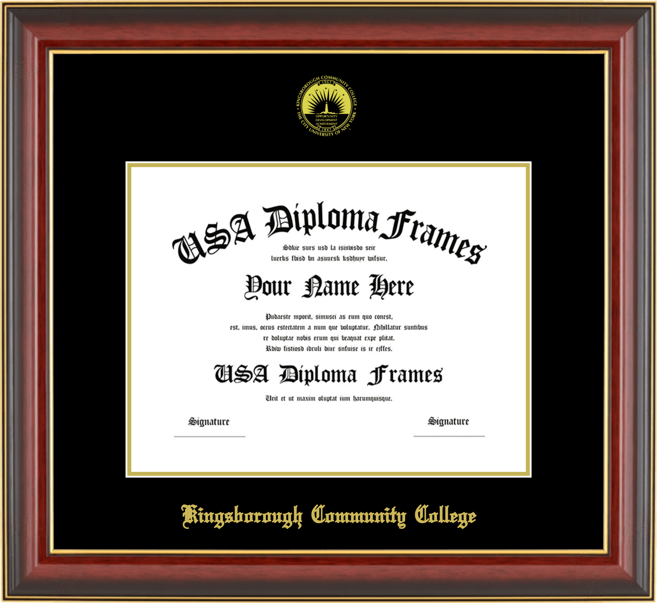 Kingsborough College Diploma Frame – Cherry Mahogany Gold Trim Glossy – Black and Gold Mat