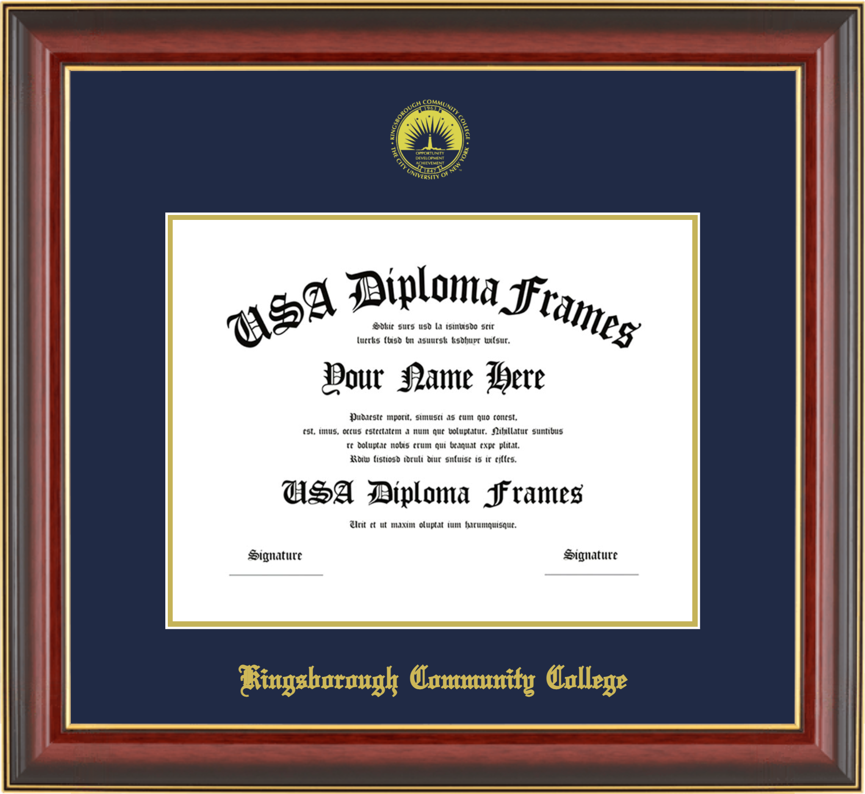 Kingsborough Community College of the City University of New York – Single Horizontal Document ( 8 1/2″x11″ ) – Cherry Mahogany Gold Trim Glossy – Navy Mat – Gold Accent Mat – With Seal(University Seal Gold) – With Gold Embossing (Kingsborough Community College)