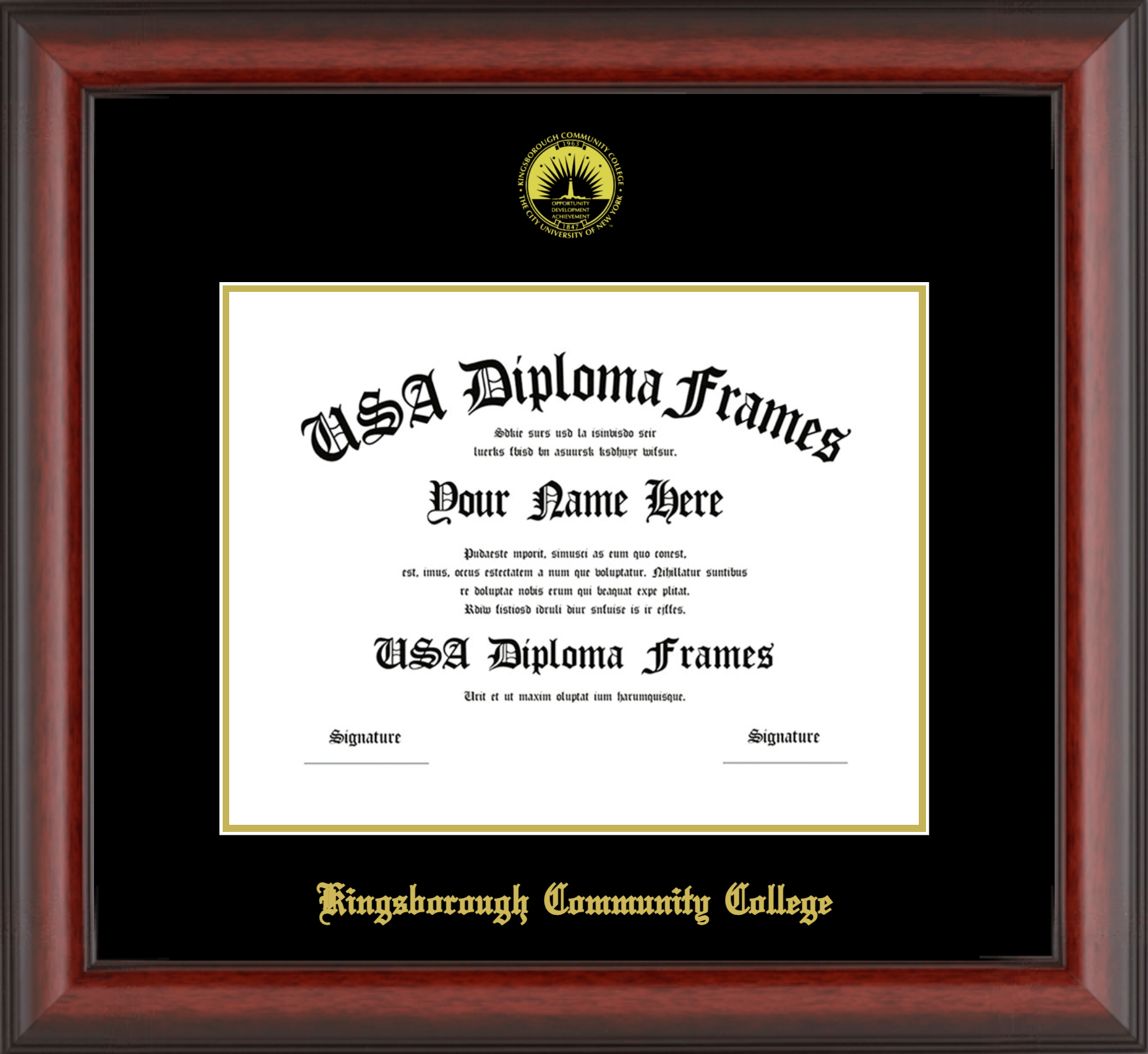 Kingsborough Community College Diploma Frame – Cherry Mahogany Matte – Black and Gold Mat
