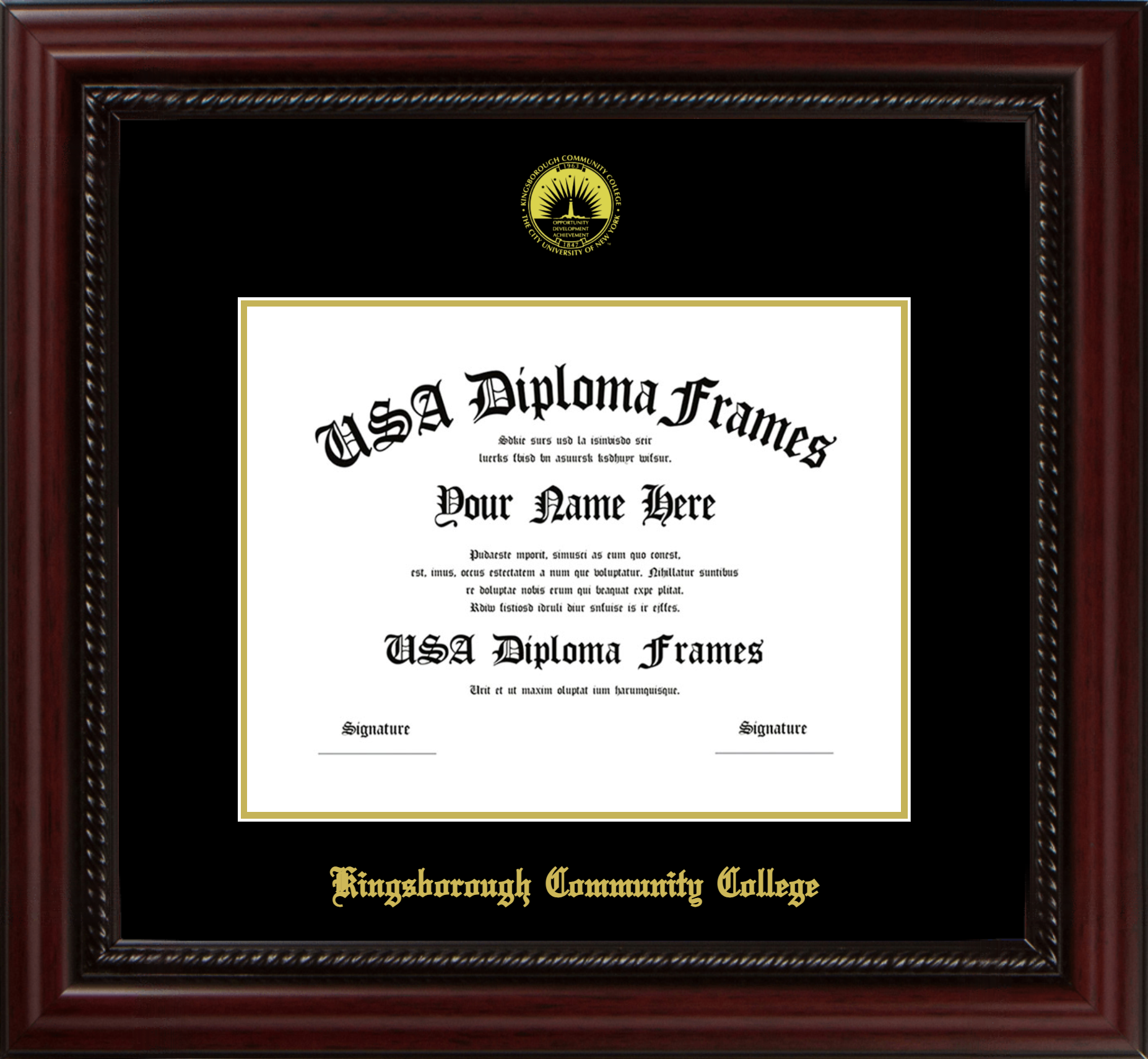 Kingsborough Community College Diploma Frame – Executive Cherry Rope – Black and Gold Mat