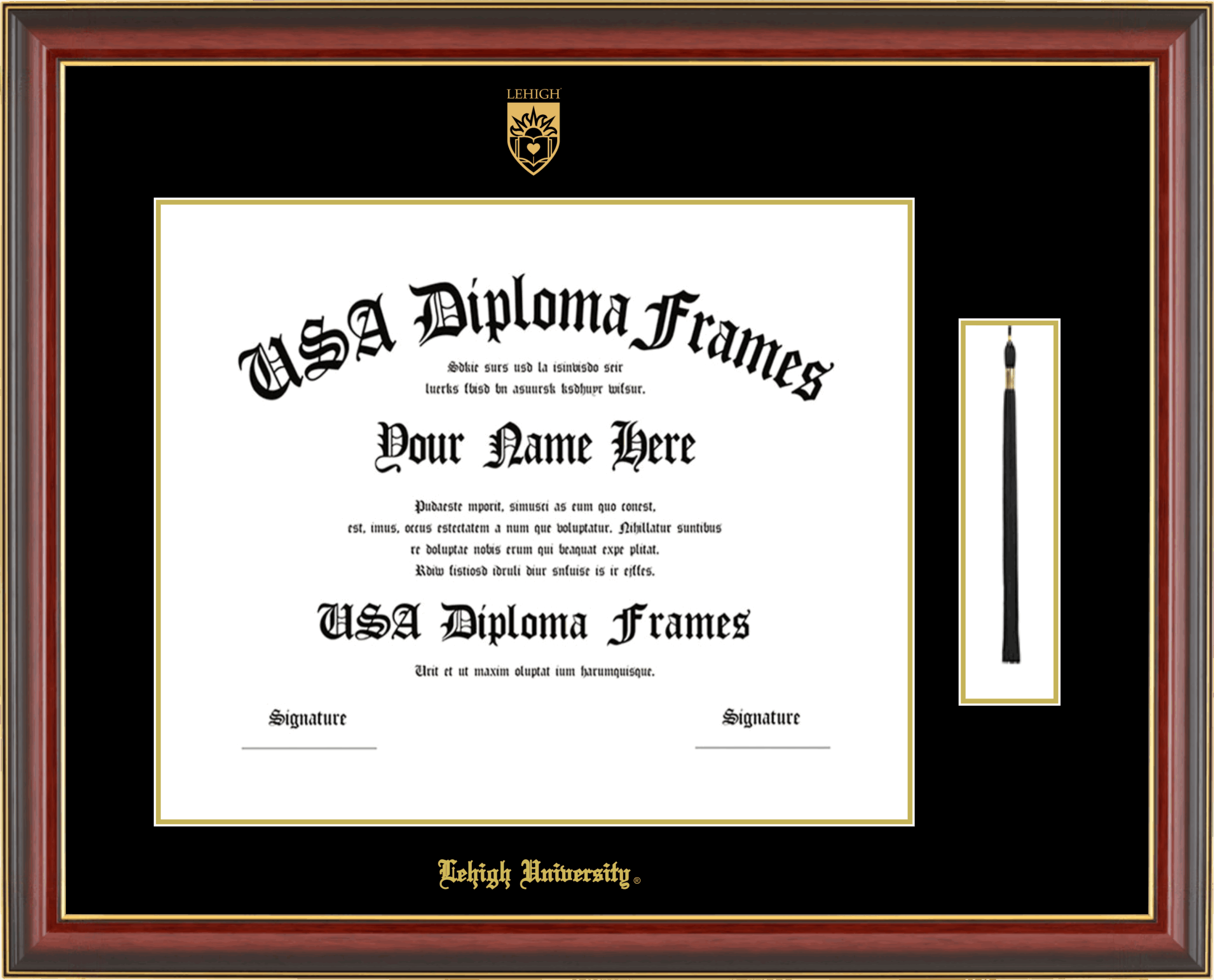 Lehigh University Diploma Frame with Tassel – Cherry Mahogany Gold Trim Glossy – Black and Gold Mat