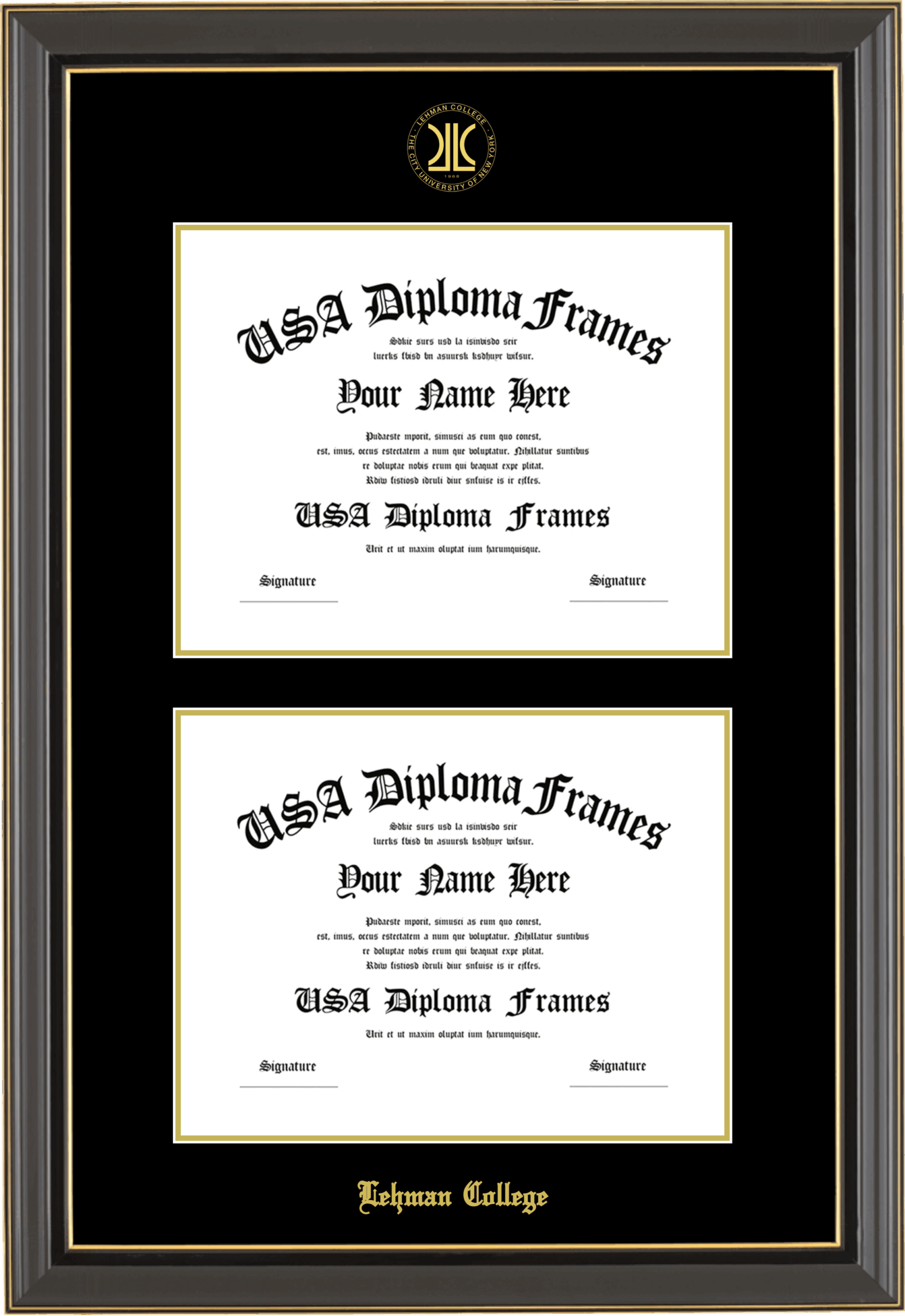 Lehman College Double Diploma Frame – Black Gold Trim Glossy – Black and Gold Mat