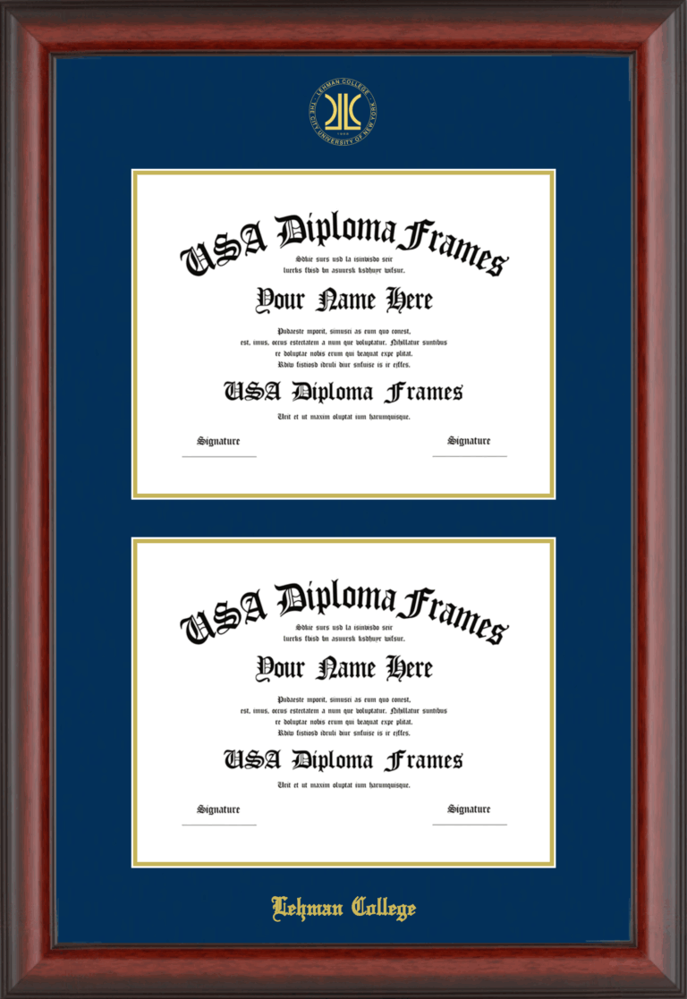 Lehman College Double Diploma Frame – Double Document – Cherry Mahogany Matte – Navy and Gold Mat