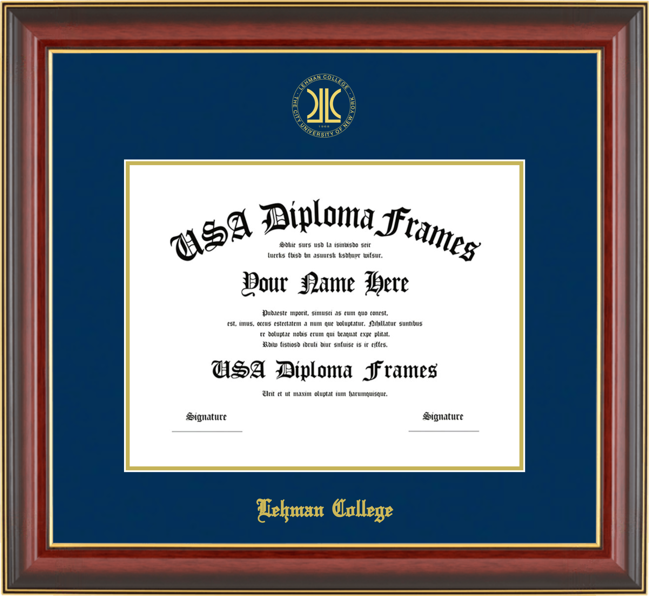 Lehman College Diploma Frame – Cherry Mahogany Gold Trim Glossy – Navy and Gold Mat