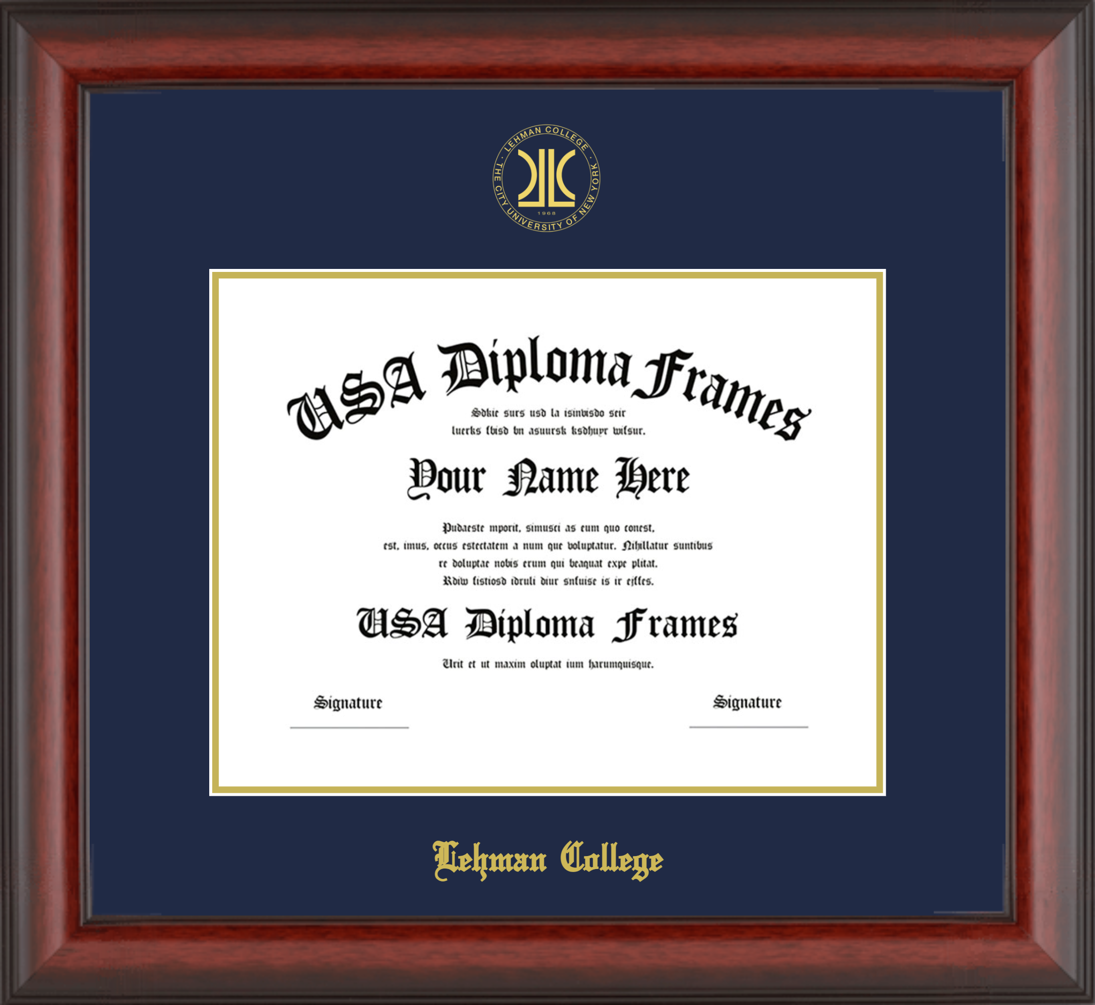 Lehman College of the City University of New York – Single Horizontal Document ( 8 1/2″x11″ ) – Cherry Mahogany Matte – Navy Mat – Gold Accent Mat – With Seal(University Seal Gold) – With Gold Embossing (Lehman College)