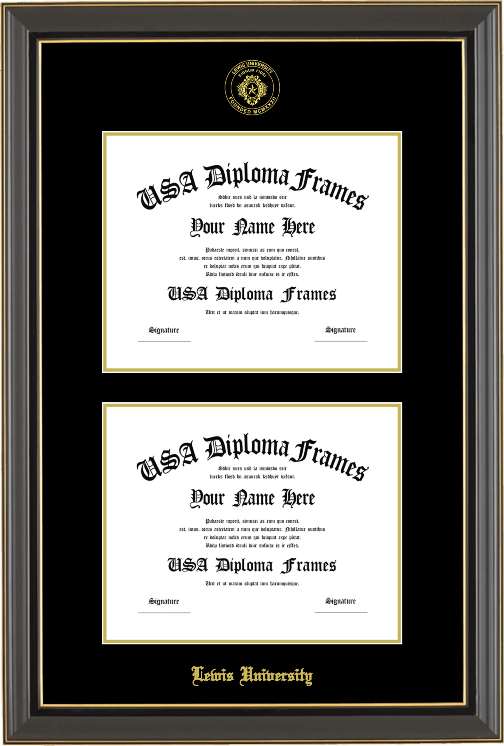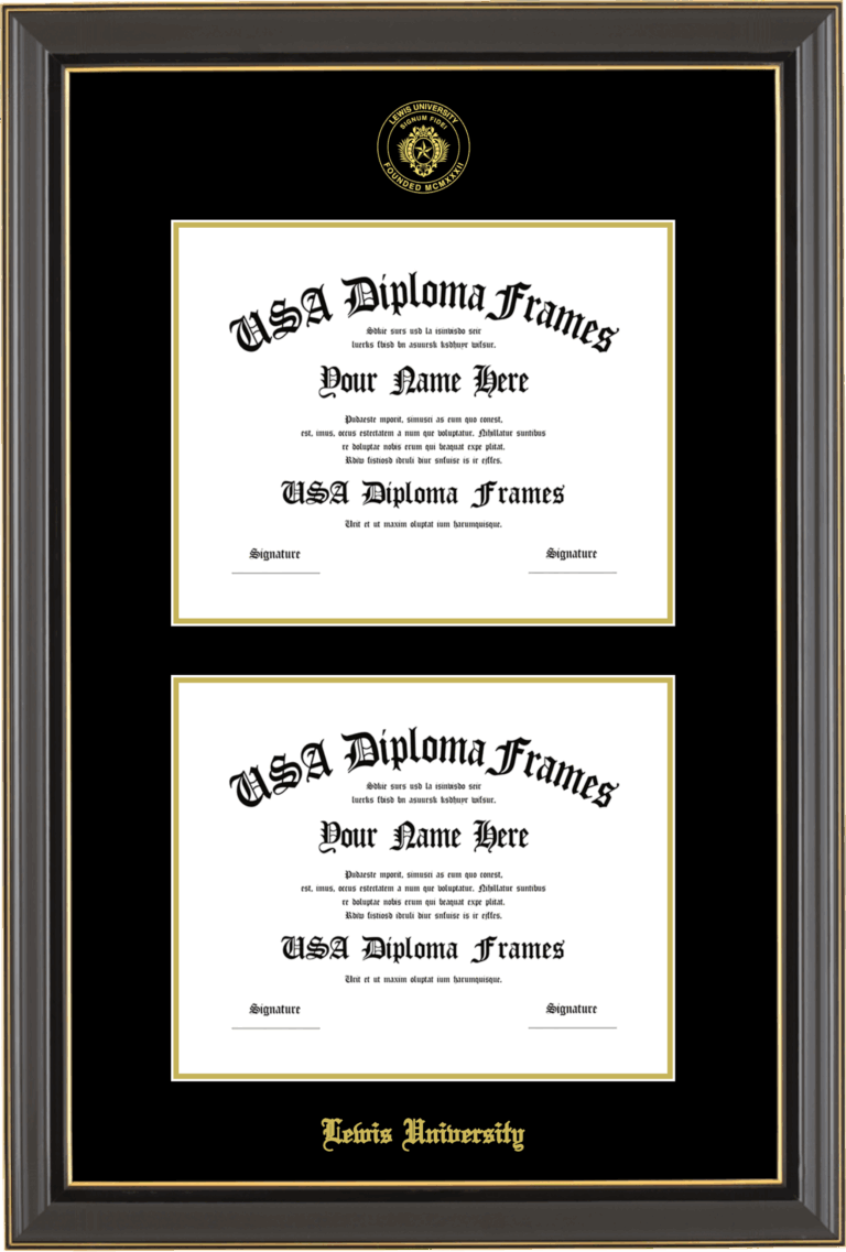Lewis University Double Diploma Frame – Double Document – Black Gold Trim Glossy – Black and Gold Mat
