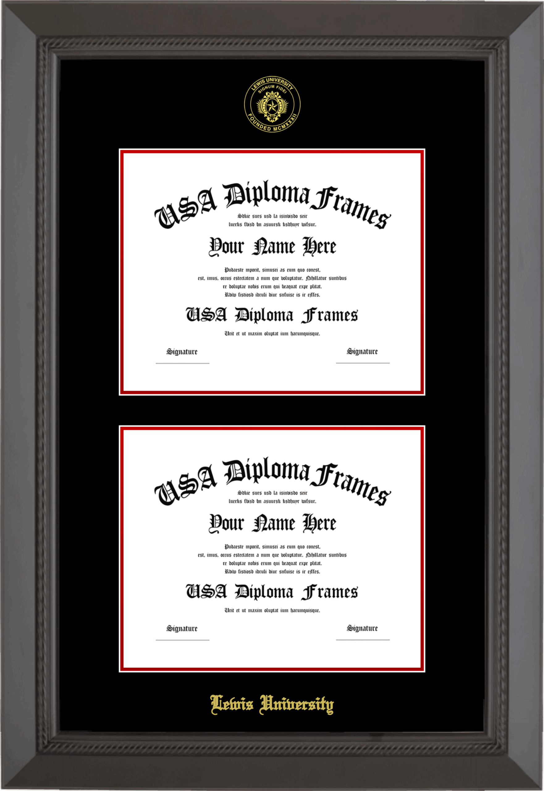 Lewis University Double Diploma Frame – Double Document – Black Rope – Black and Red Mat