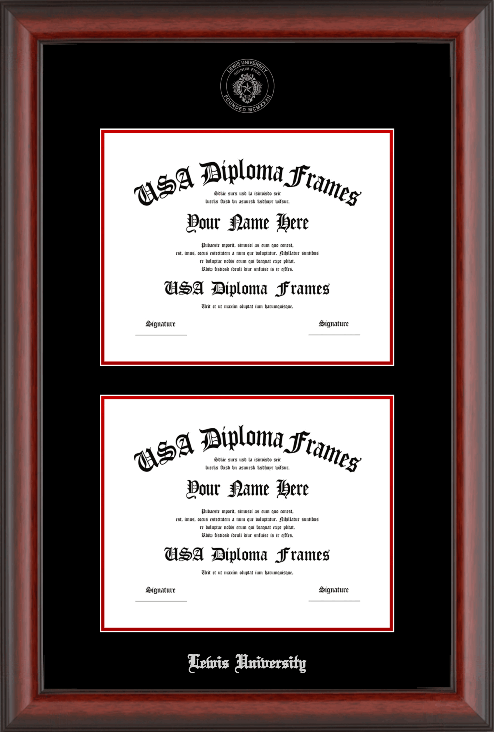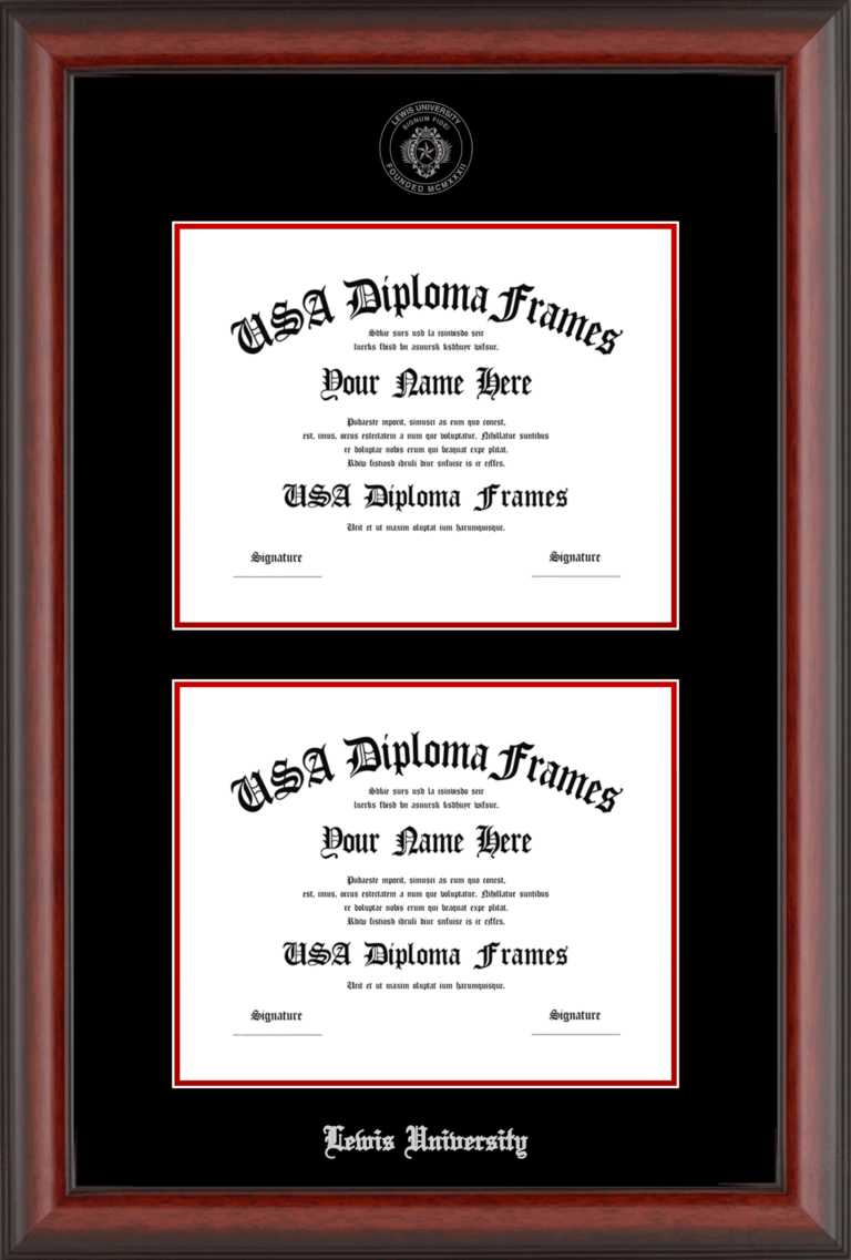 Lewis University Double Diploma Frame – Double Document – Cherry Mahogany Matte – Black and Red Mat