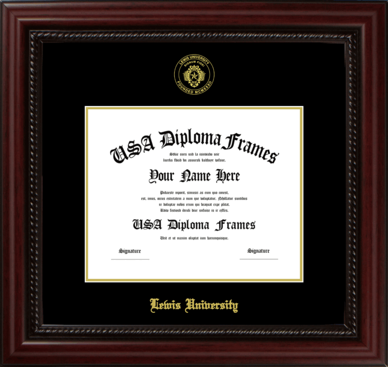 Lewis University Diploma Frame – Executive Cherry Rope – Black and Gold Mat