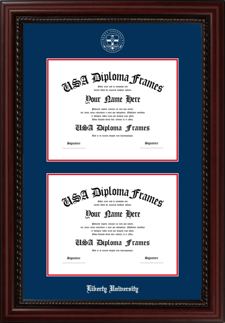 Liberty University Double Diploma Frame – Double Document – Executive Cherry Rope – Navy and Red Mat – Bachelors Degree – Silver Seal