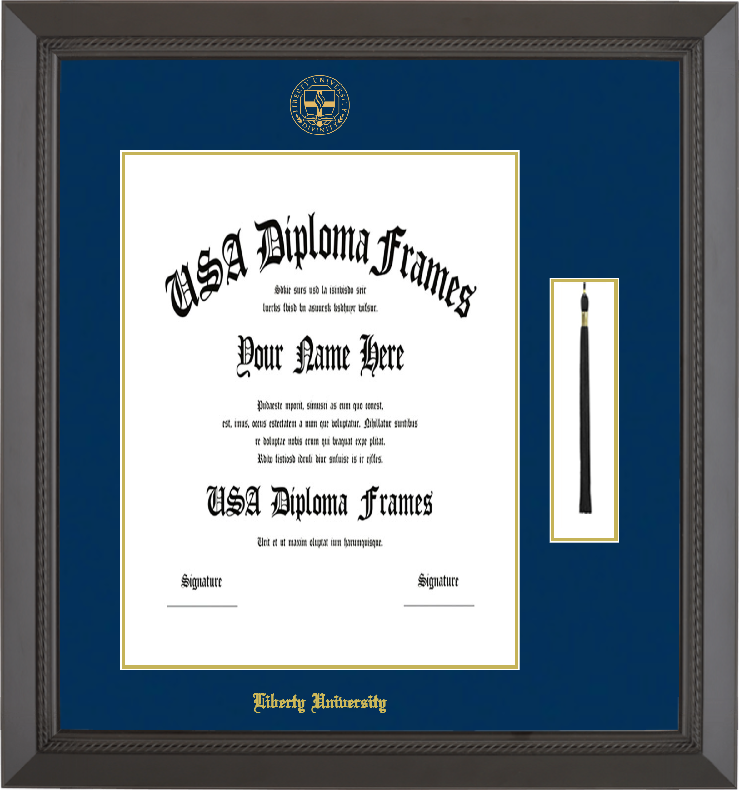 Liberty University Diploma Frame – Masters 17 x 13 – Black Rope – Navy and Gold Mat – Tassel Opening