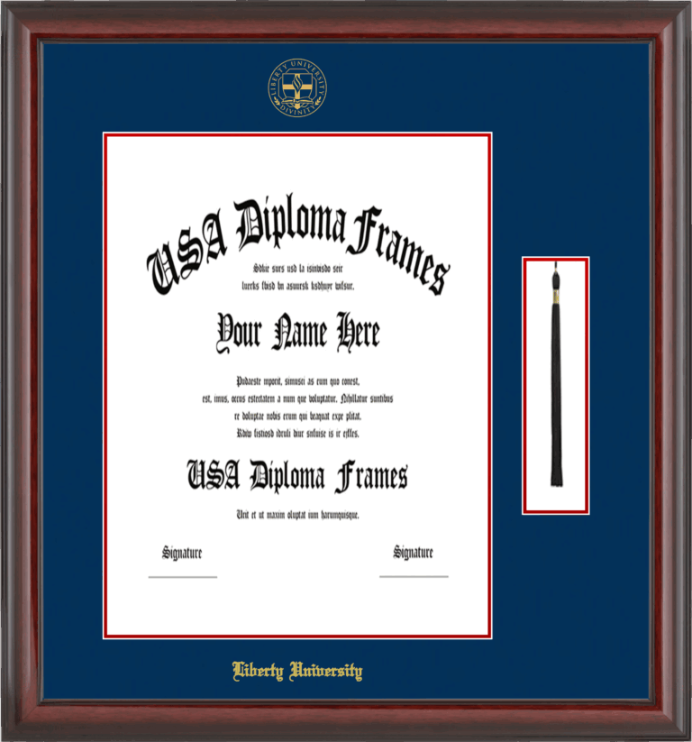 Liberty University Diploma Frame – Masters 17 x 13 – Cherry Mahogany Glossy – Navy and Red Mat – Tassel Opening