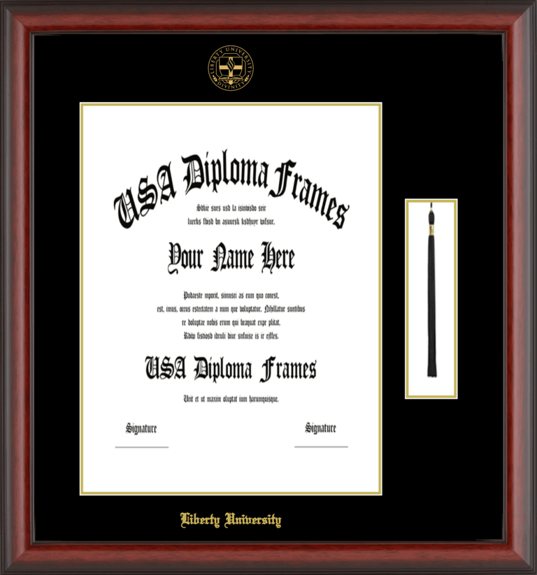 Liberty University Diploma Frame – Masters 17 x 13 – Cherry Mahogany Matte – Black and Gold Mat – Tassel Opening