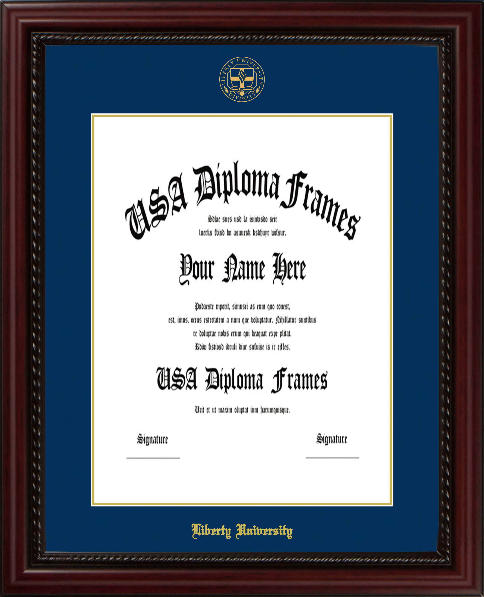 Liberty University Diploma Frame – Masters 17 x 13 – Executive Cherry Rope – Navy and Gold Mat