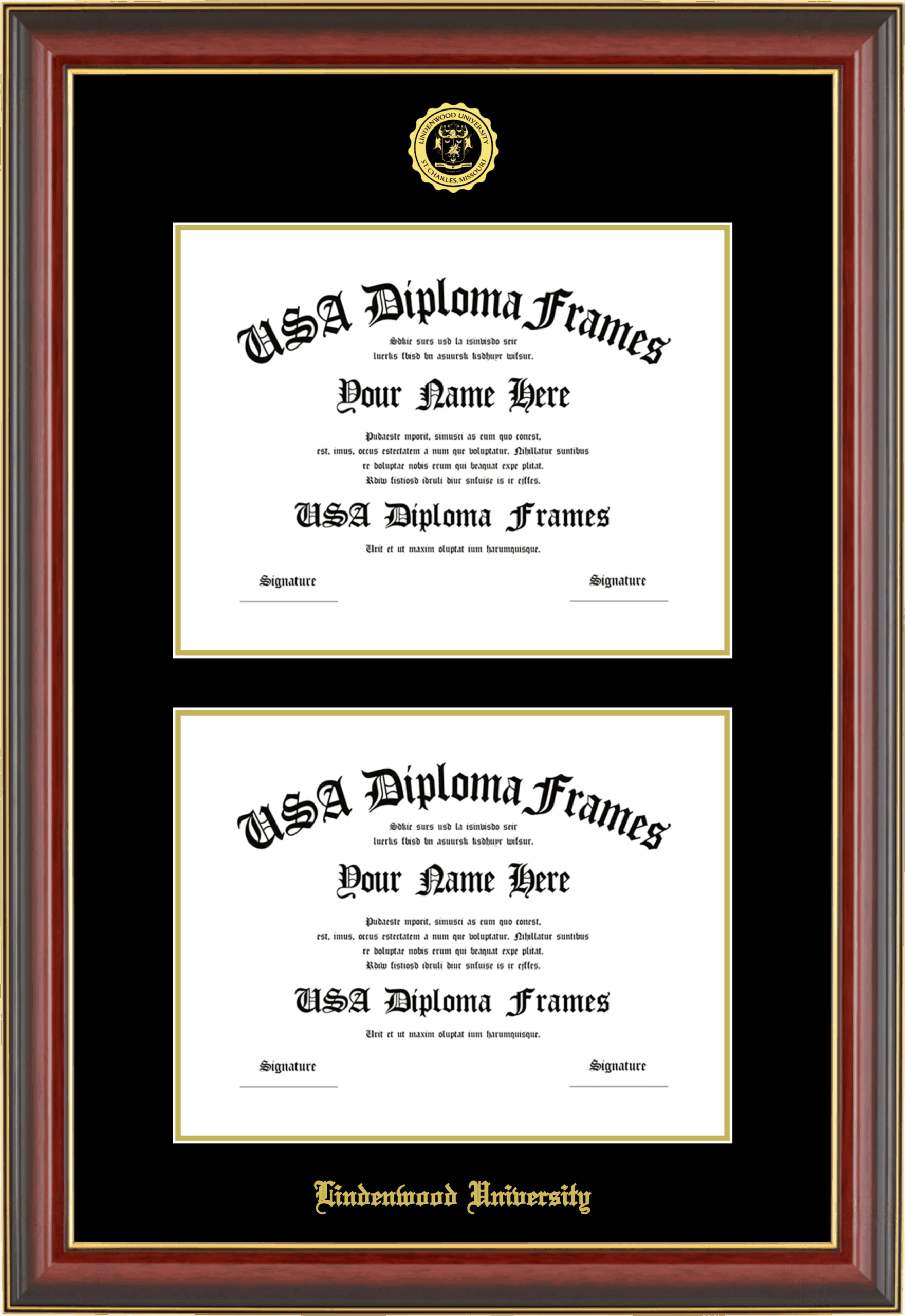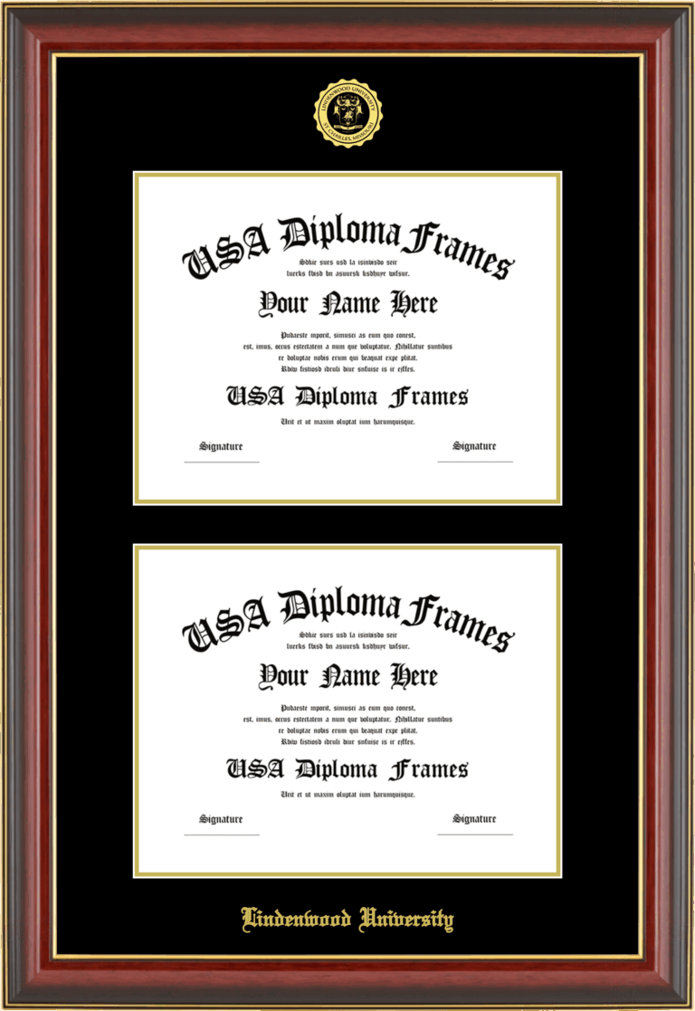 Lindenwood University Double Diploma Frame – Double Document – Cherry Mahogany Gold Trim Glossy – Black and Gold Mat