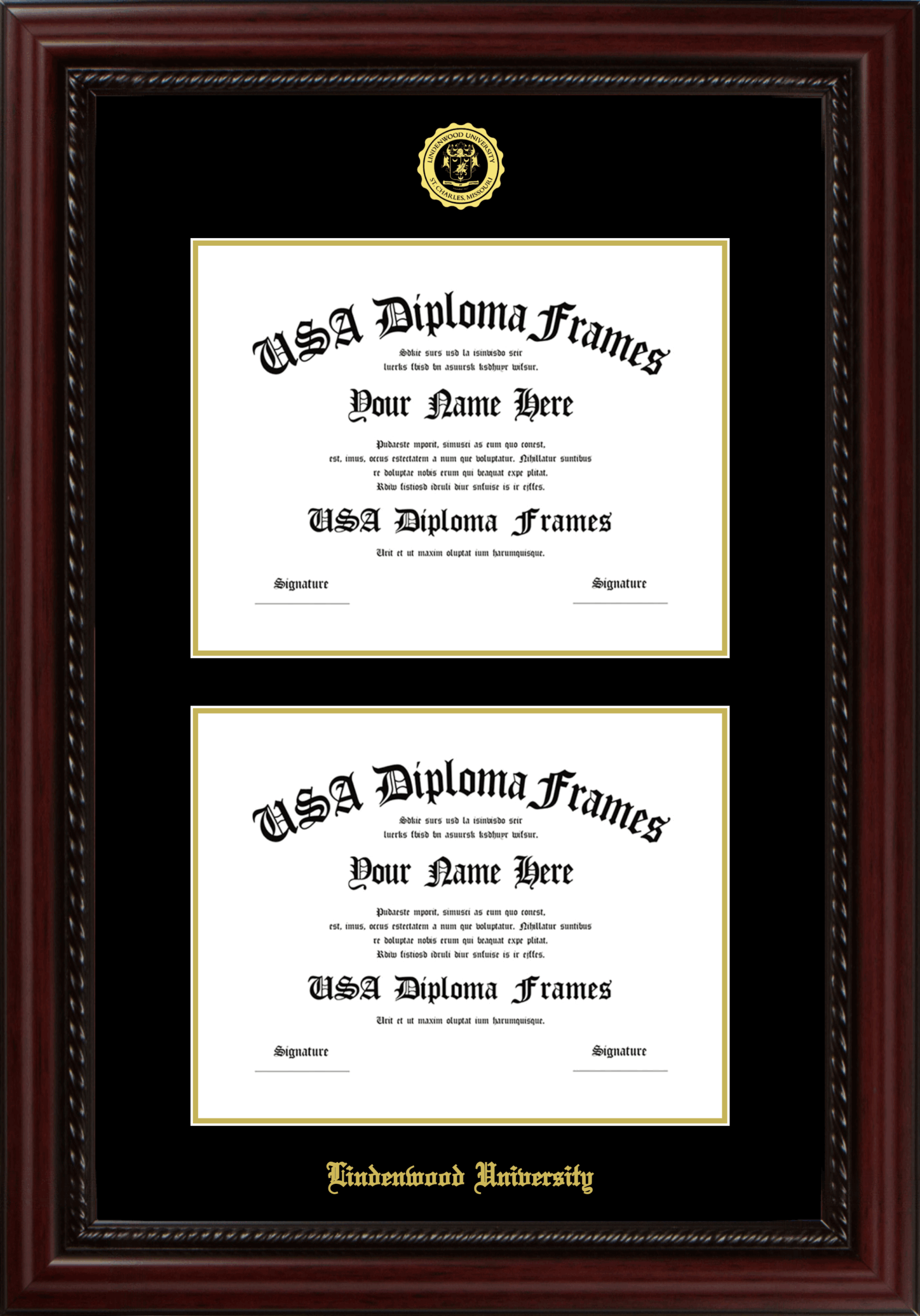 Lindenwood University Double Diploma Frame – Double Document – Executive Cherry Rope – Black and Gold Mat