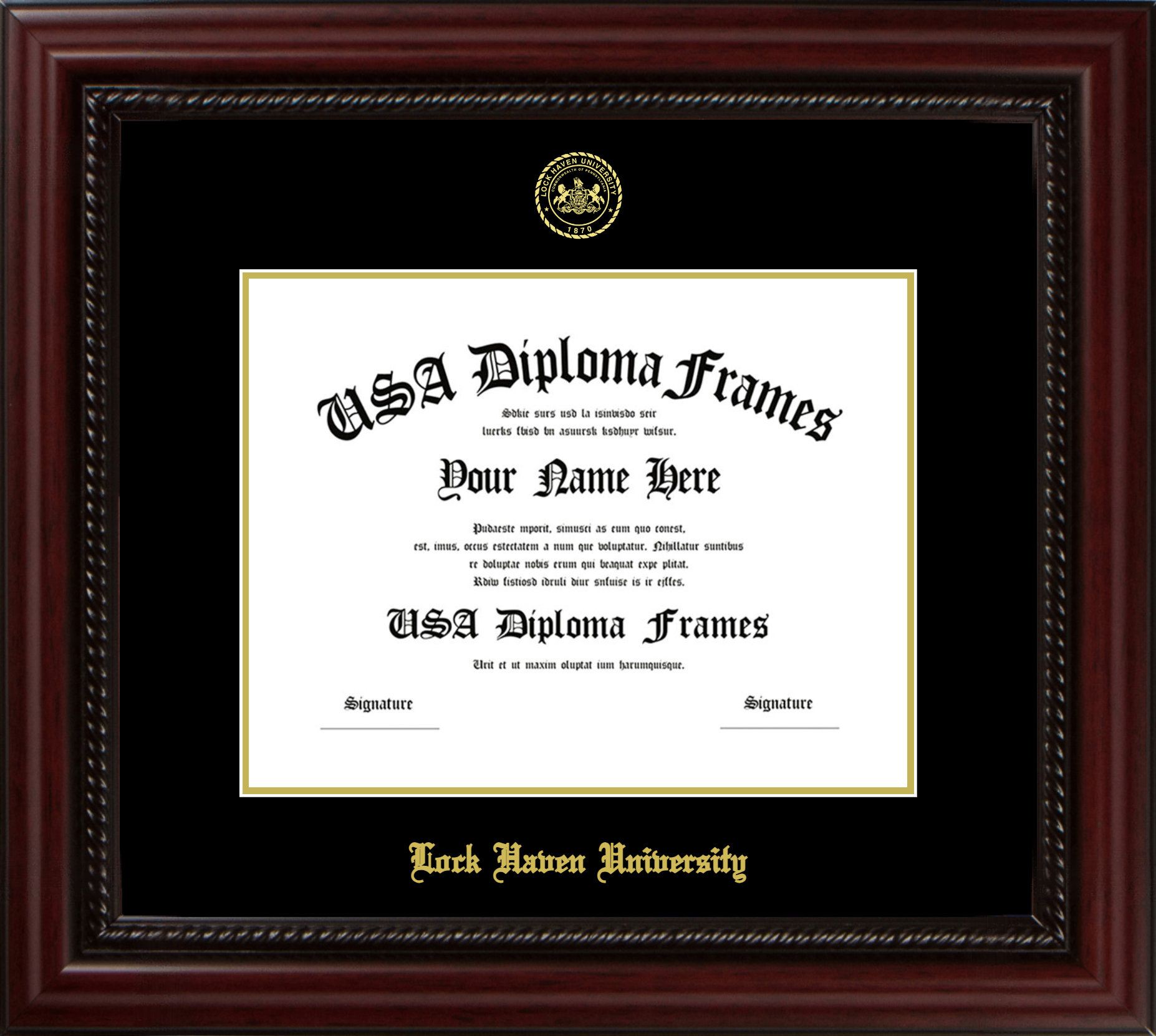 Lock Haven University Diploma Frame – Executive Cherry Rope – Black and Gold Mat