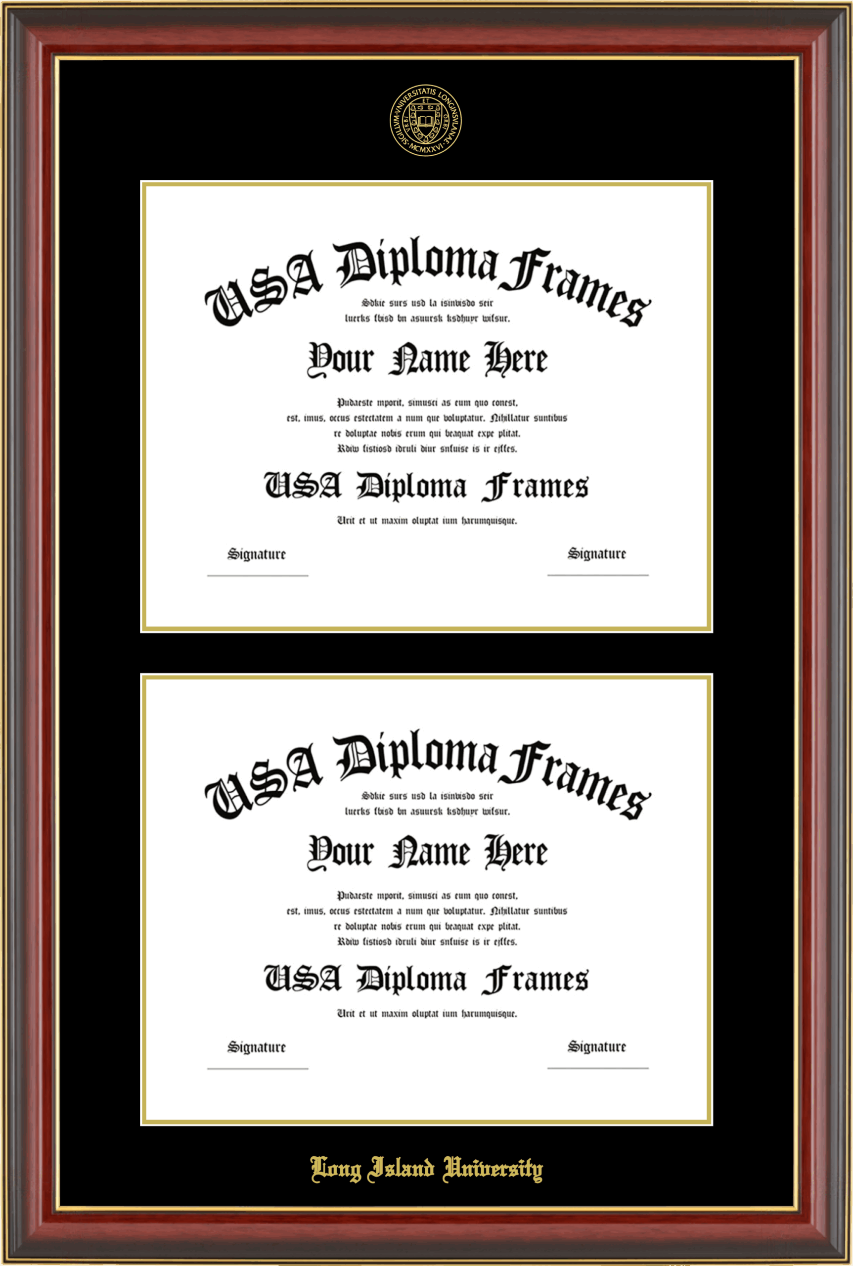 Long Island University Double Diploma Frame – Double Document – Cherry Mahogany Gold Trim Glossy – Black and Gold Mat