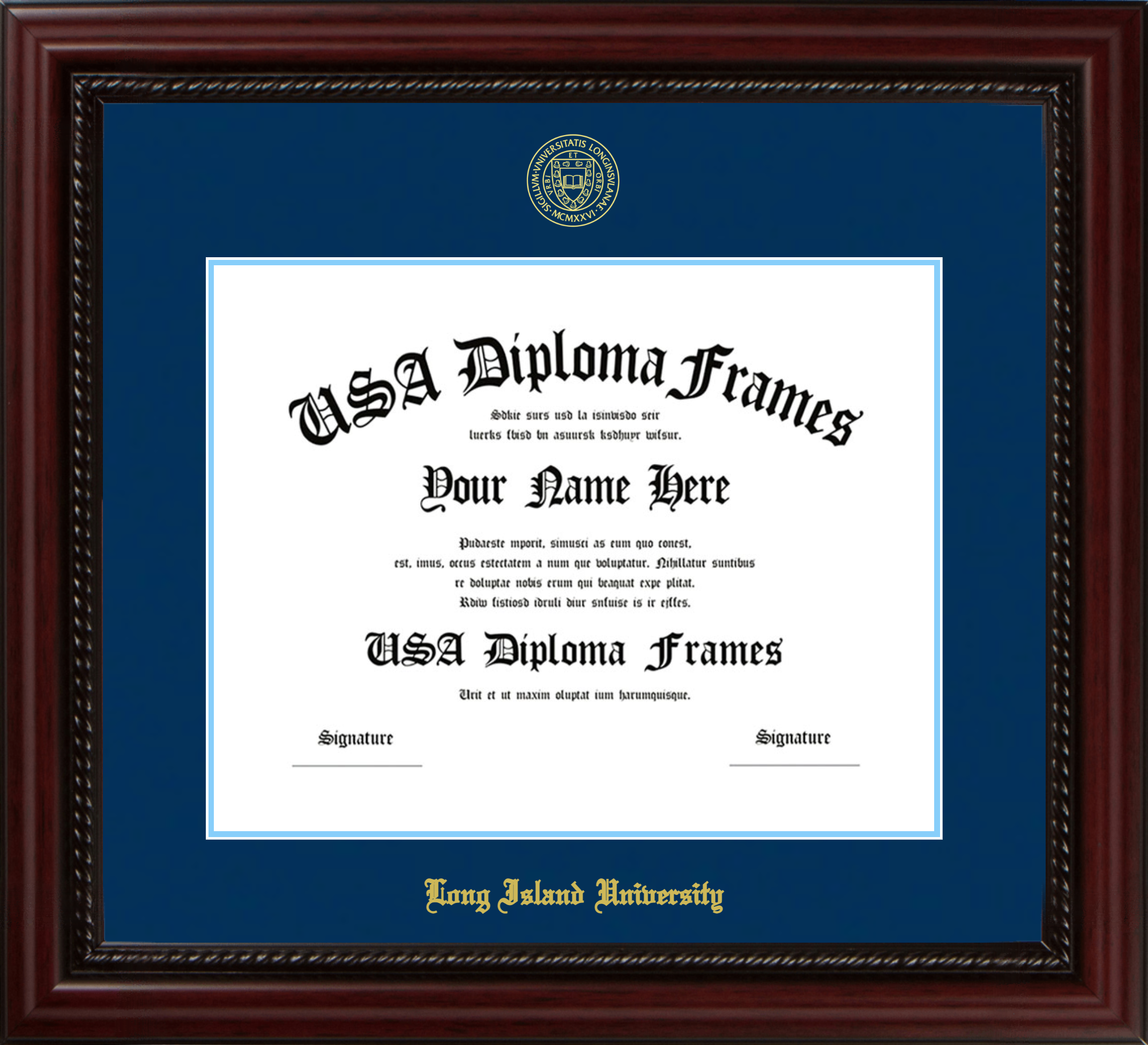 Long Island University Diploma Frame- Executive Cherry Rope – Navy and Light Blue Mat