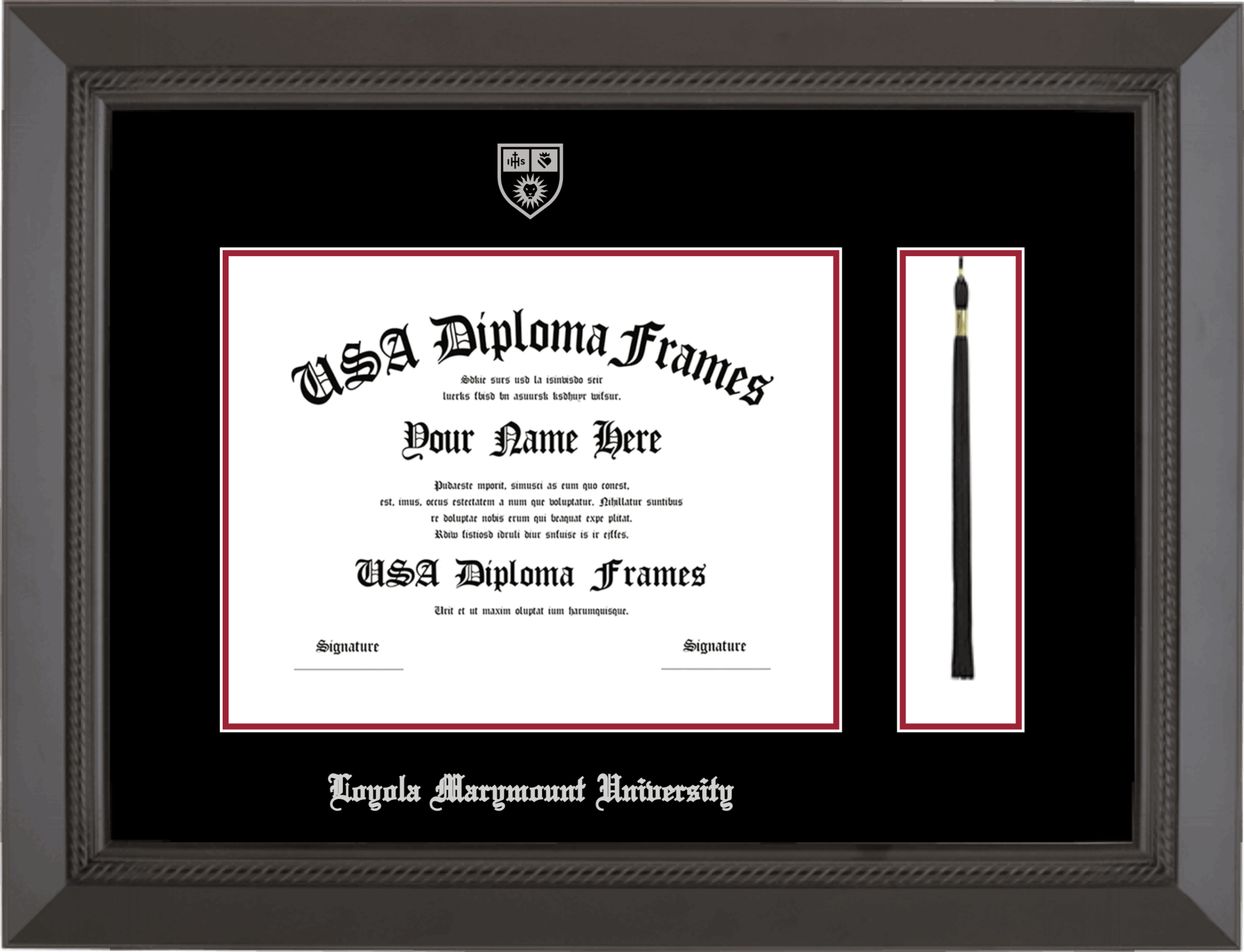 Loyola Marymount University Diploma Frame with Tassel – Black Rope – Black and Crimson Mat – Silver Seal