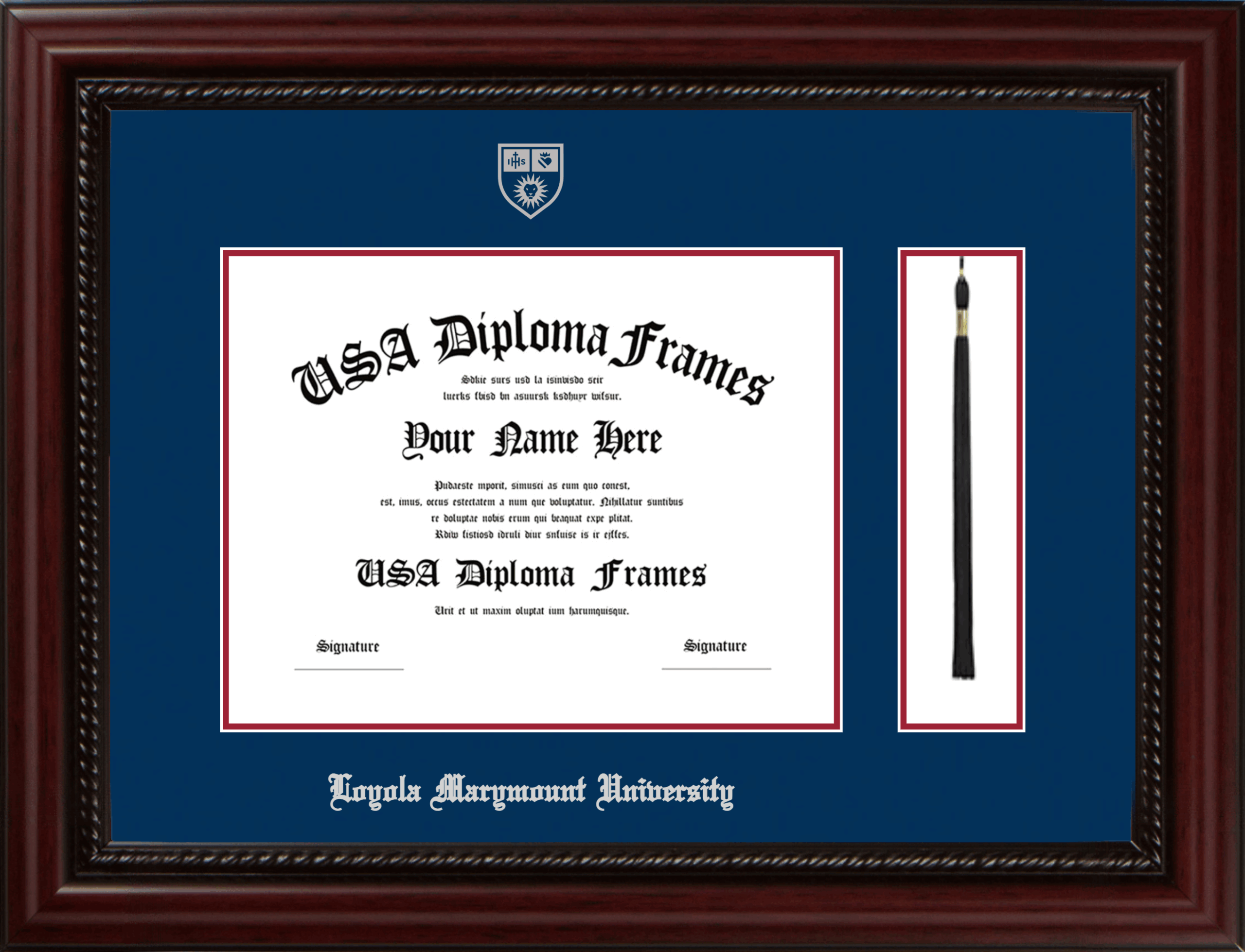 Loyola Marymount University Diploma Frame with Tassel – Executive Cherry Rope – Navy and Crimson Mat – Silver Seal