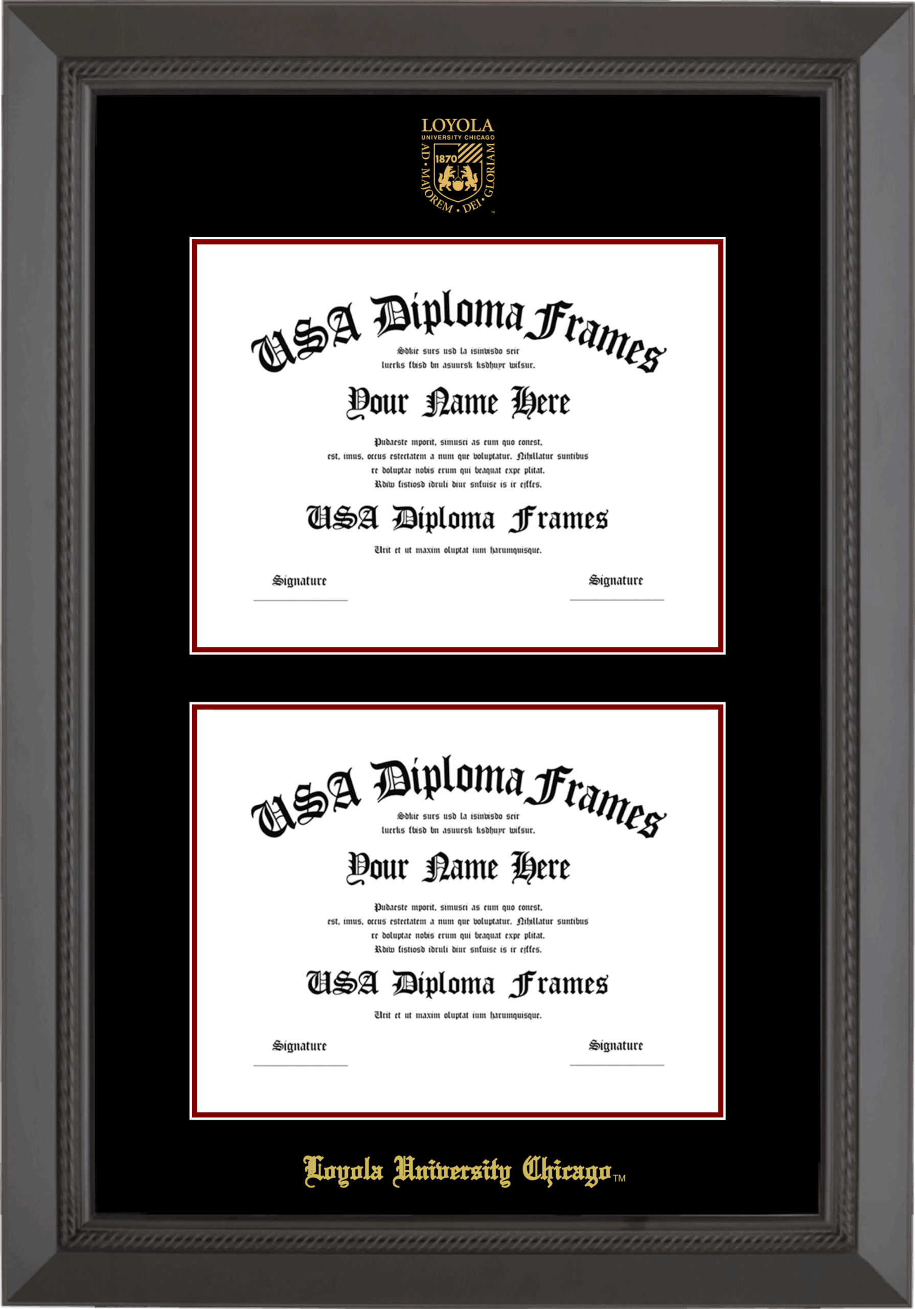 Loyola University Chicago Double Diploma Frame – Double Document – Black Rope – Black and Maroon Mat