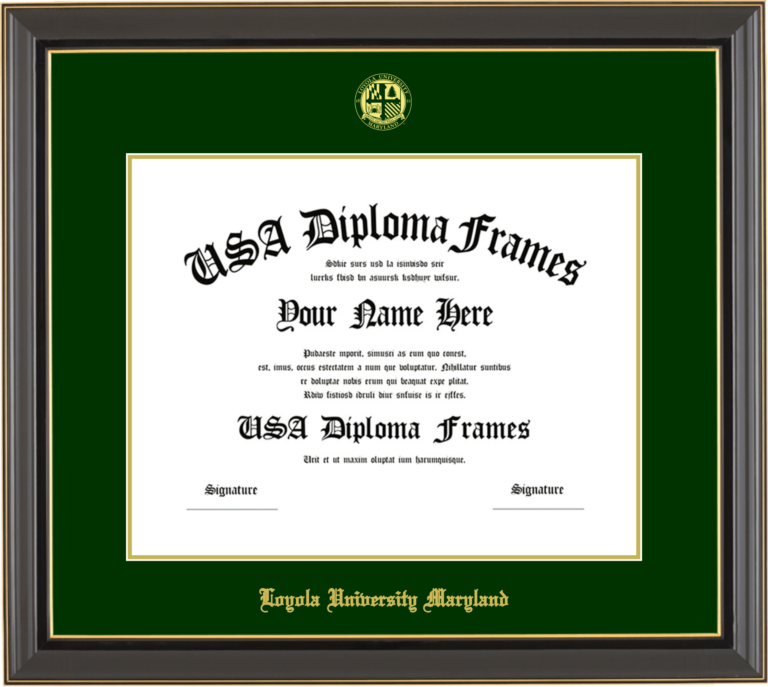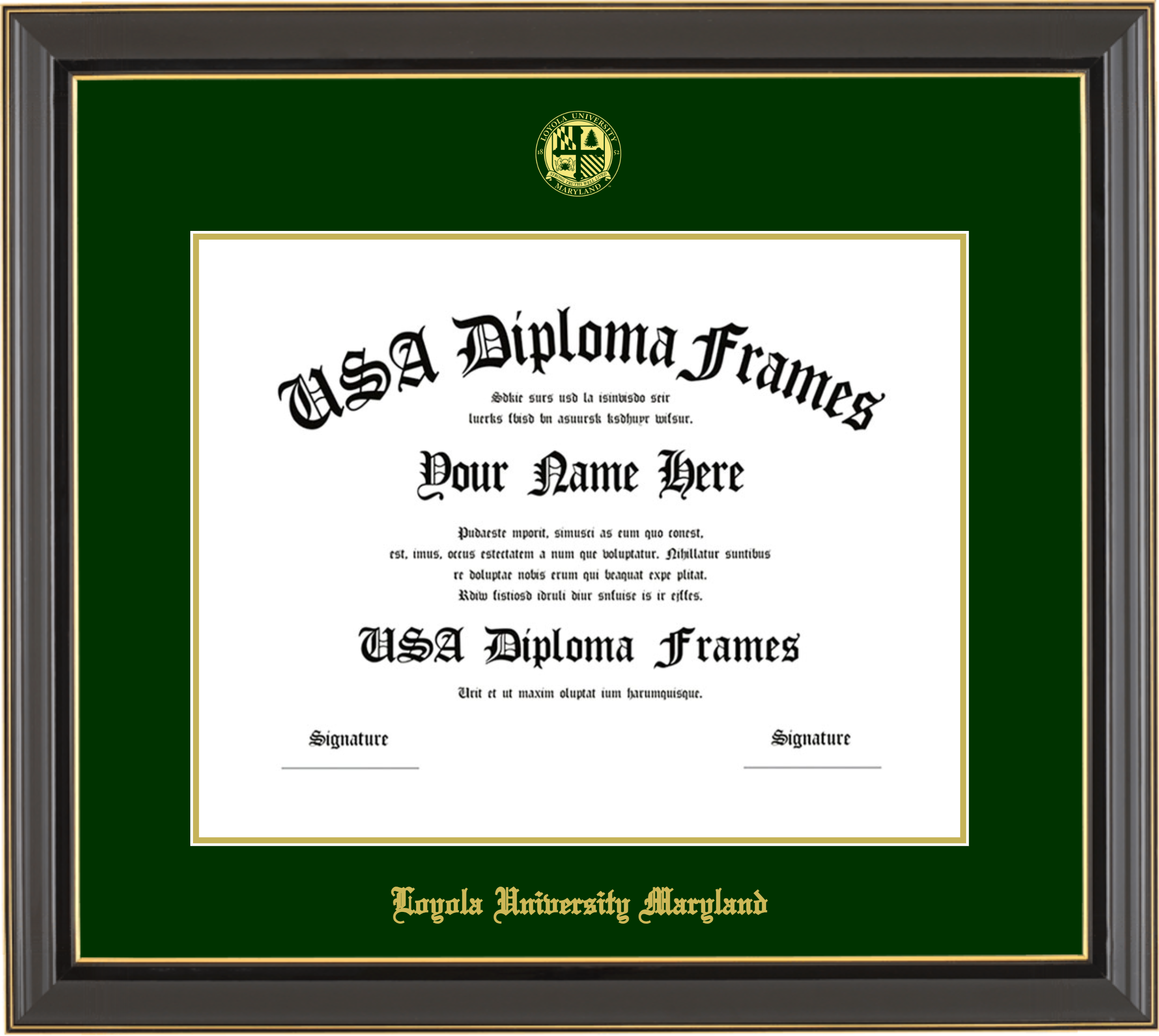 Loyola University Maryland – Single Horizontal Document ( Diploma ) – Black Gold Trim Glossy – Winter Green Mat – Gold Accent Mat – With Seal(University Seal Gold) – With Gold Embossing (Loyola University Maryland)