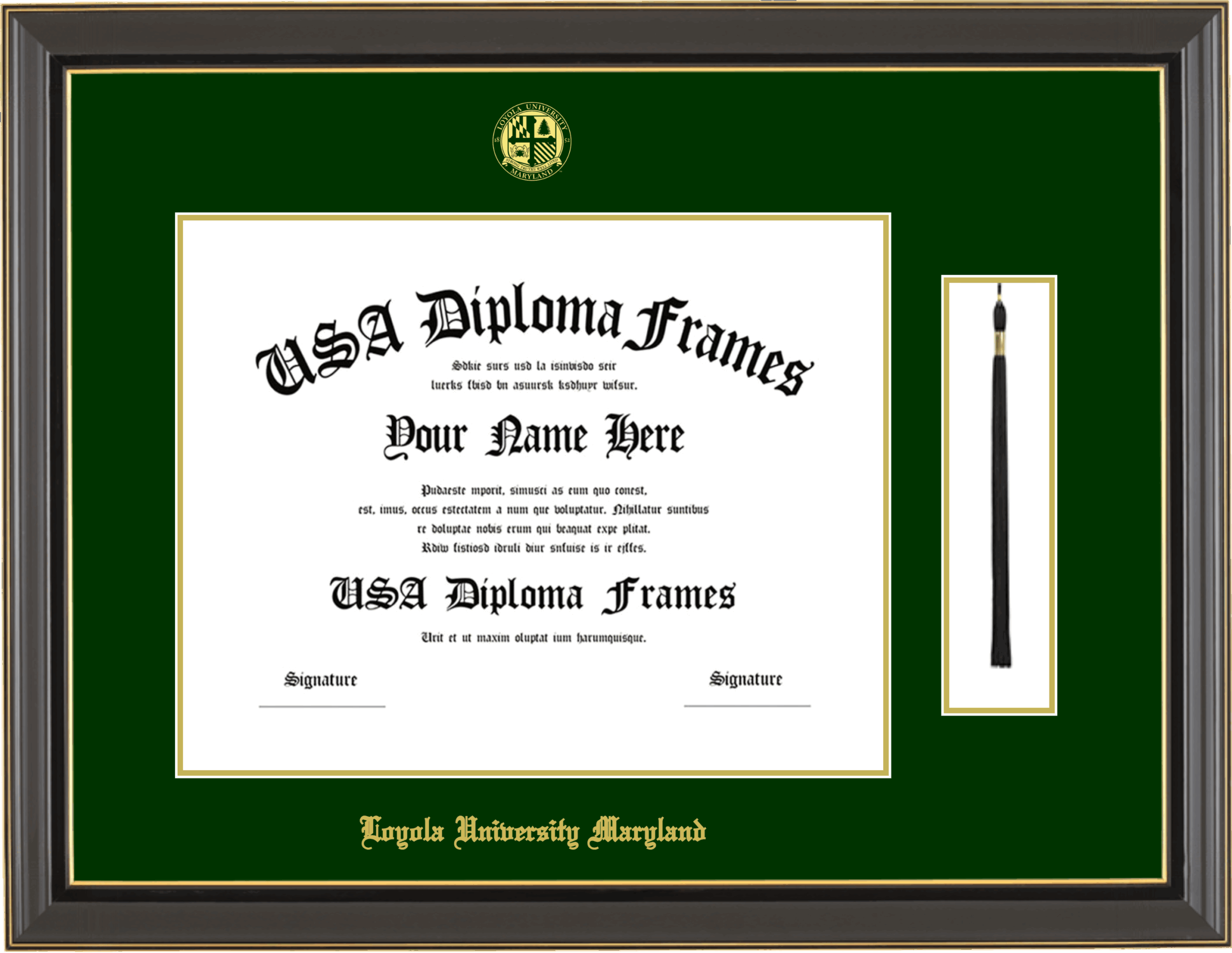 Loyola University Maryland Diploma Frame with Tassel – Black Gold Trim Glossy – Winter Green and Gold Mat