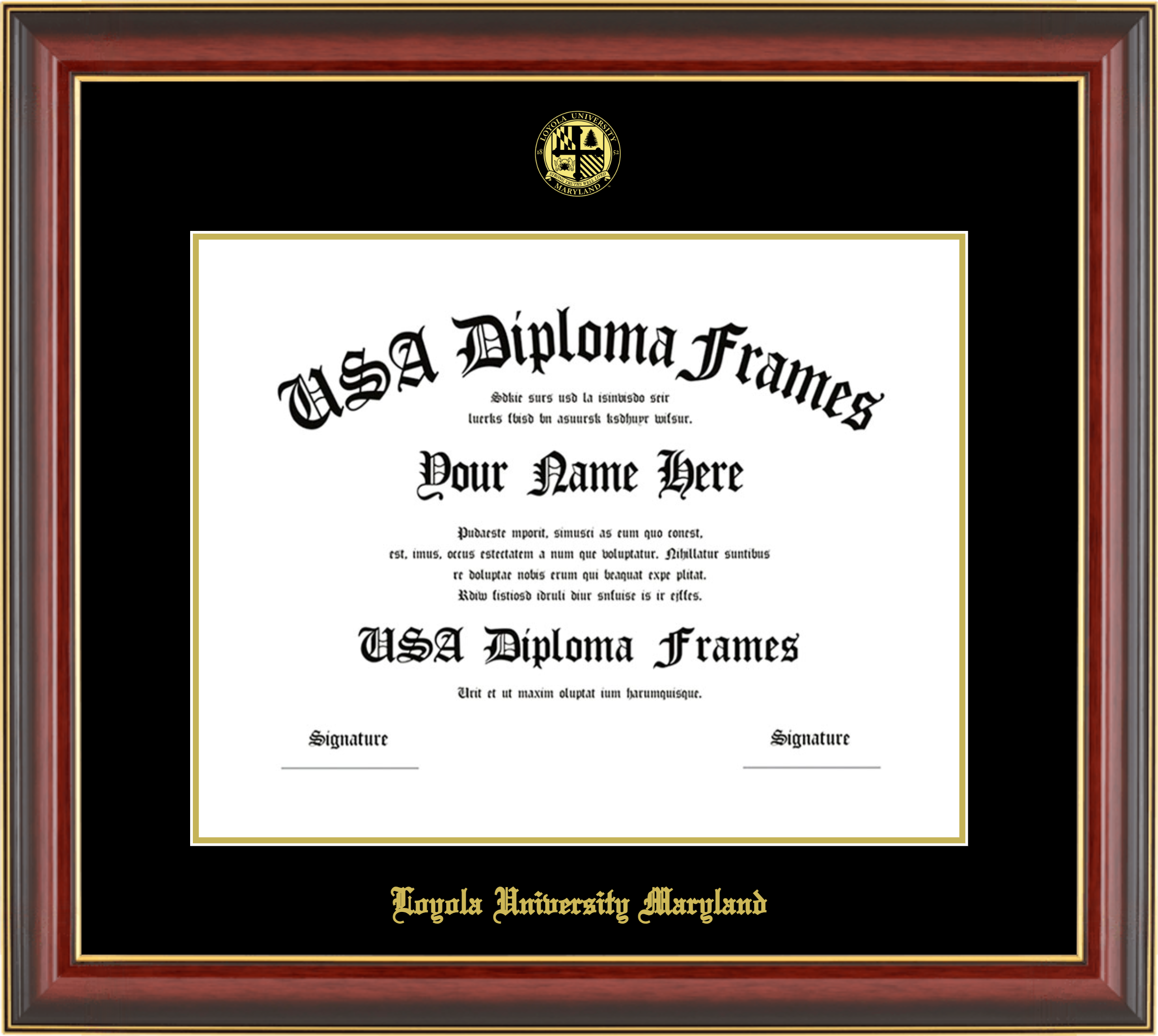 Loyola University Maryland Diploma Frame – Cherry Mahogany Gold Trim Glossy – Black and Gold Mat