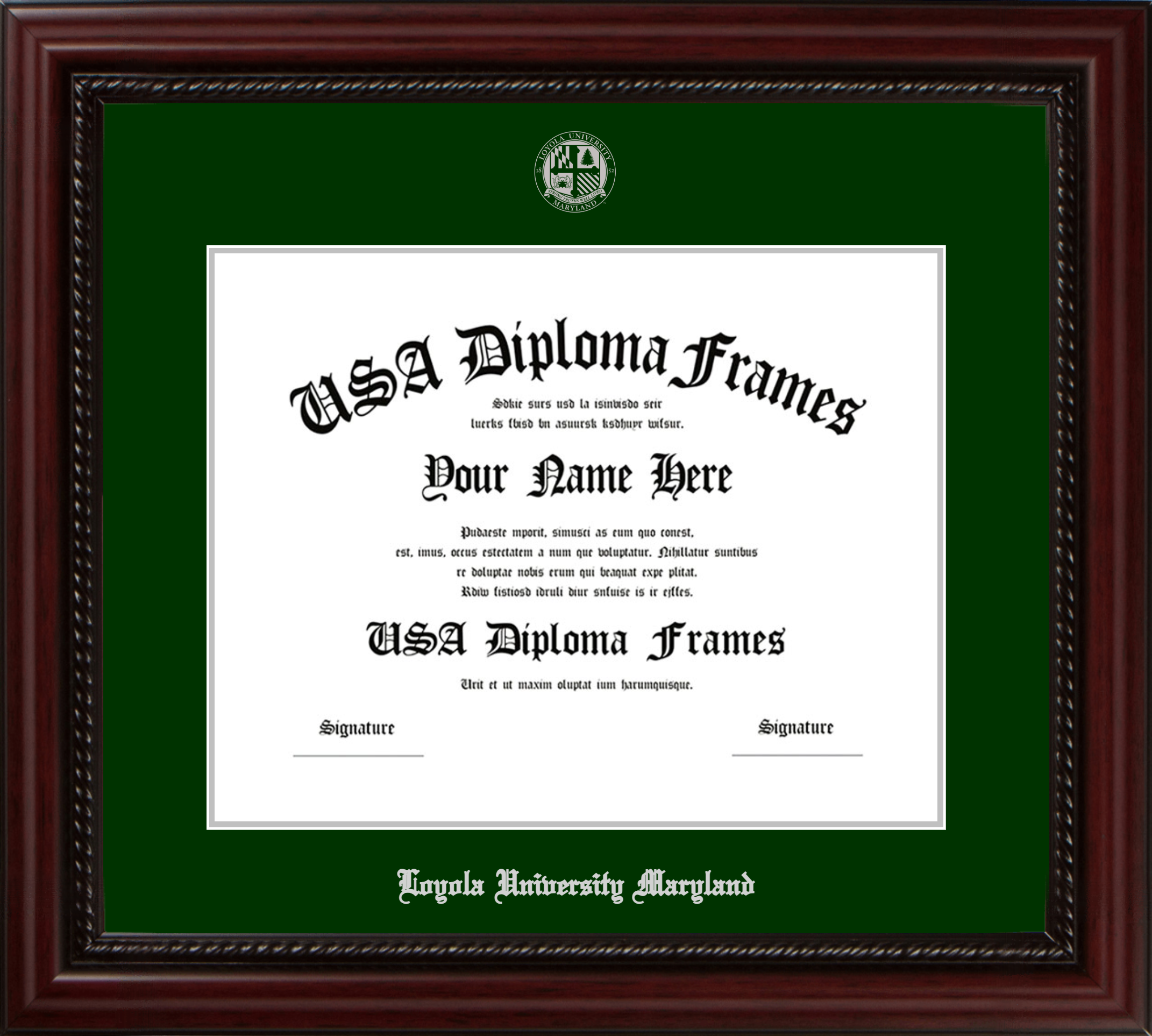 Loyola University Maryland – Single Horizontal Document ( Diploma ) – Executive Cherry Rope – Winter Green Mat – Silver Accent Mat – With Seal(University Seal Silver) – With Silver Embossing (Loyola University Maryland)