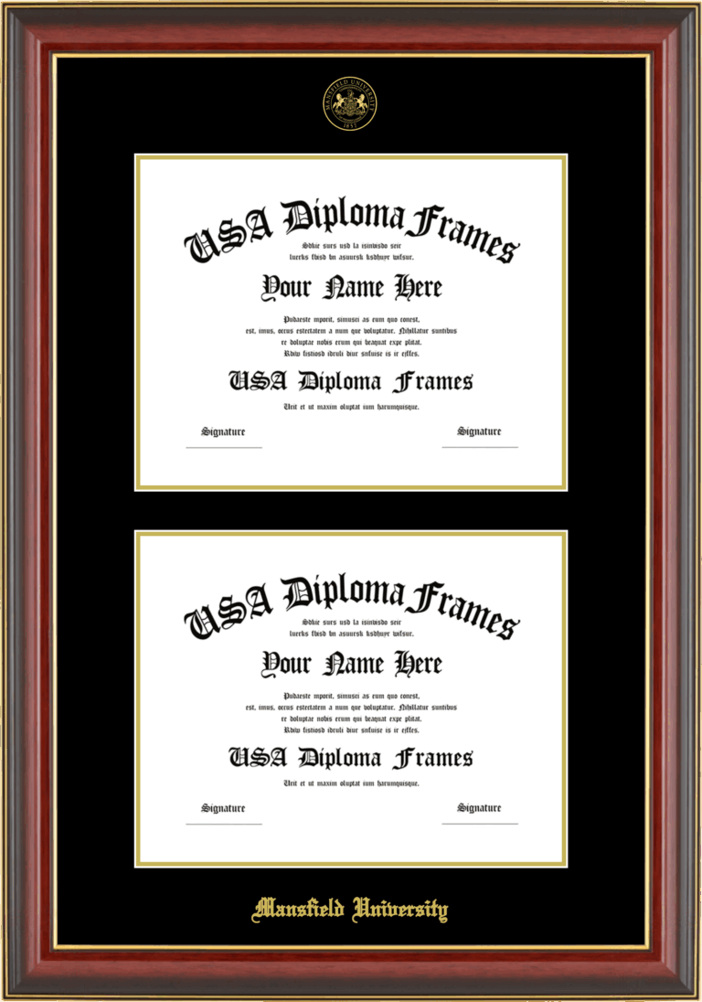 Mansfield University Double Diploma Frame – Double Document – Cherry Mahogany Gold Trim Glossy – Black and Gold Mat