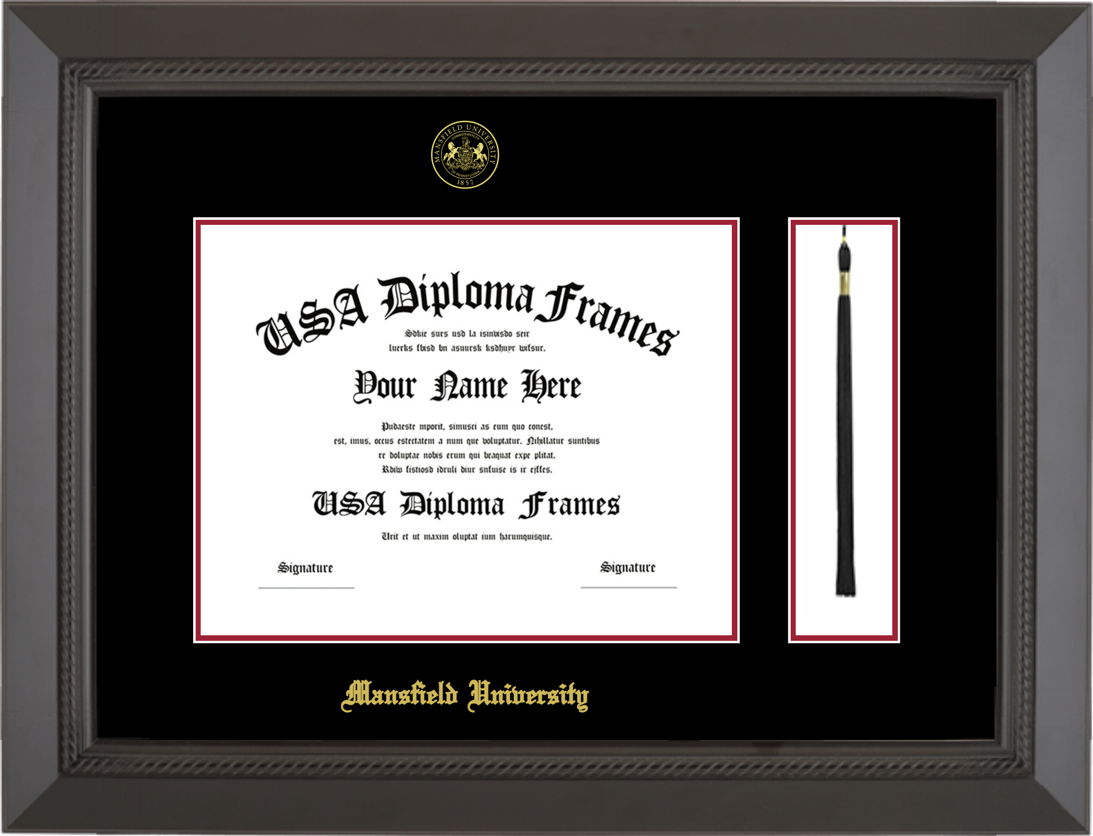 Mansfield University – Single Horizontal Document ( Diploma ) – Black Rope – Black Mat – Crimson Accent Mat – With Tassel(Default) – With Seal(University Seal Gold) – With Gold Embossing (Mansfield University)