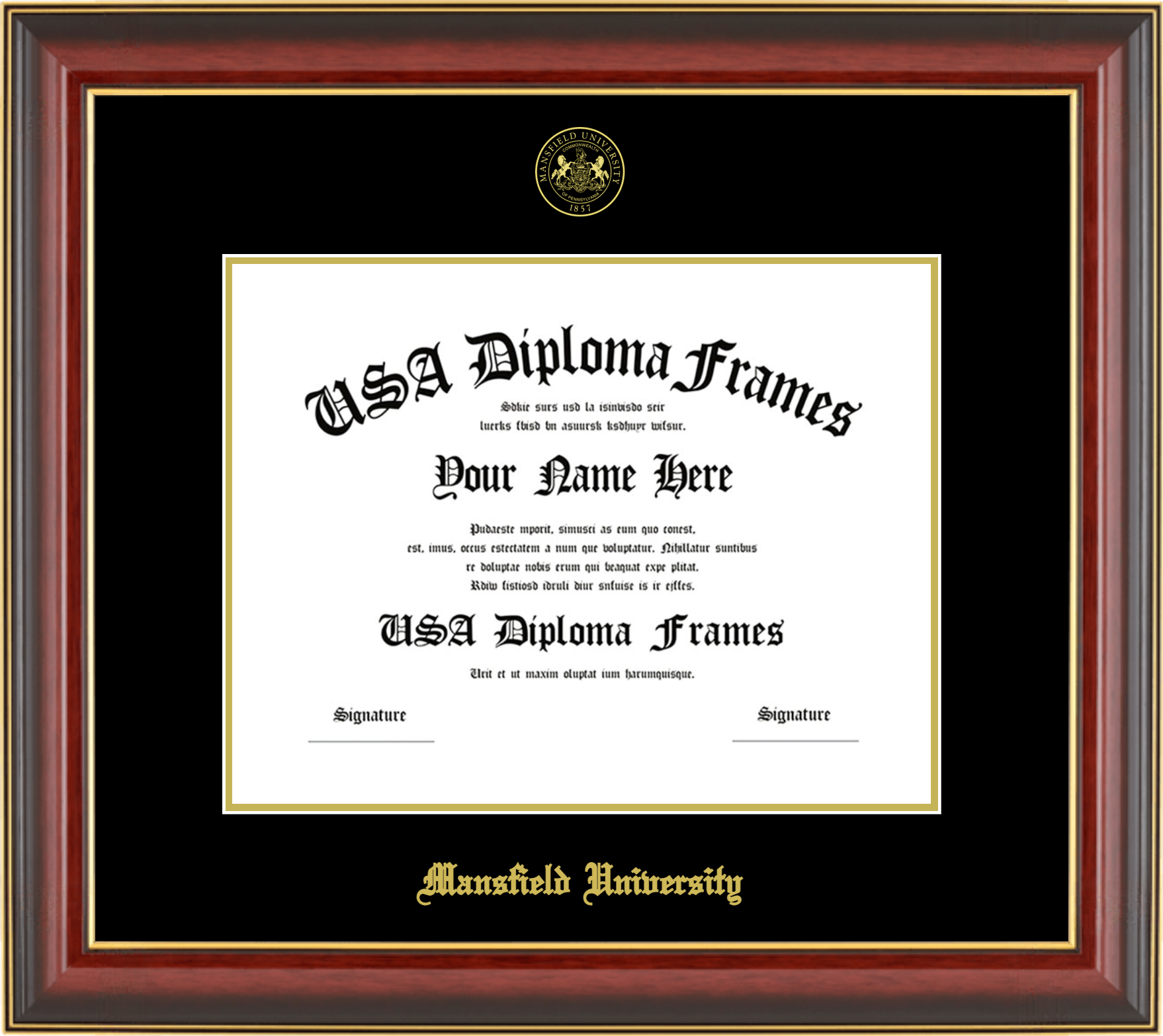 Mansfield University – Single Horizontal Document ( Diploma ) – Cherry Mahogany Gold Trim Glossy – Black Mat – Gold Accent Mat – With Seal(University Seal Gold) – With Gold Embossing (Mansfield University)