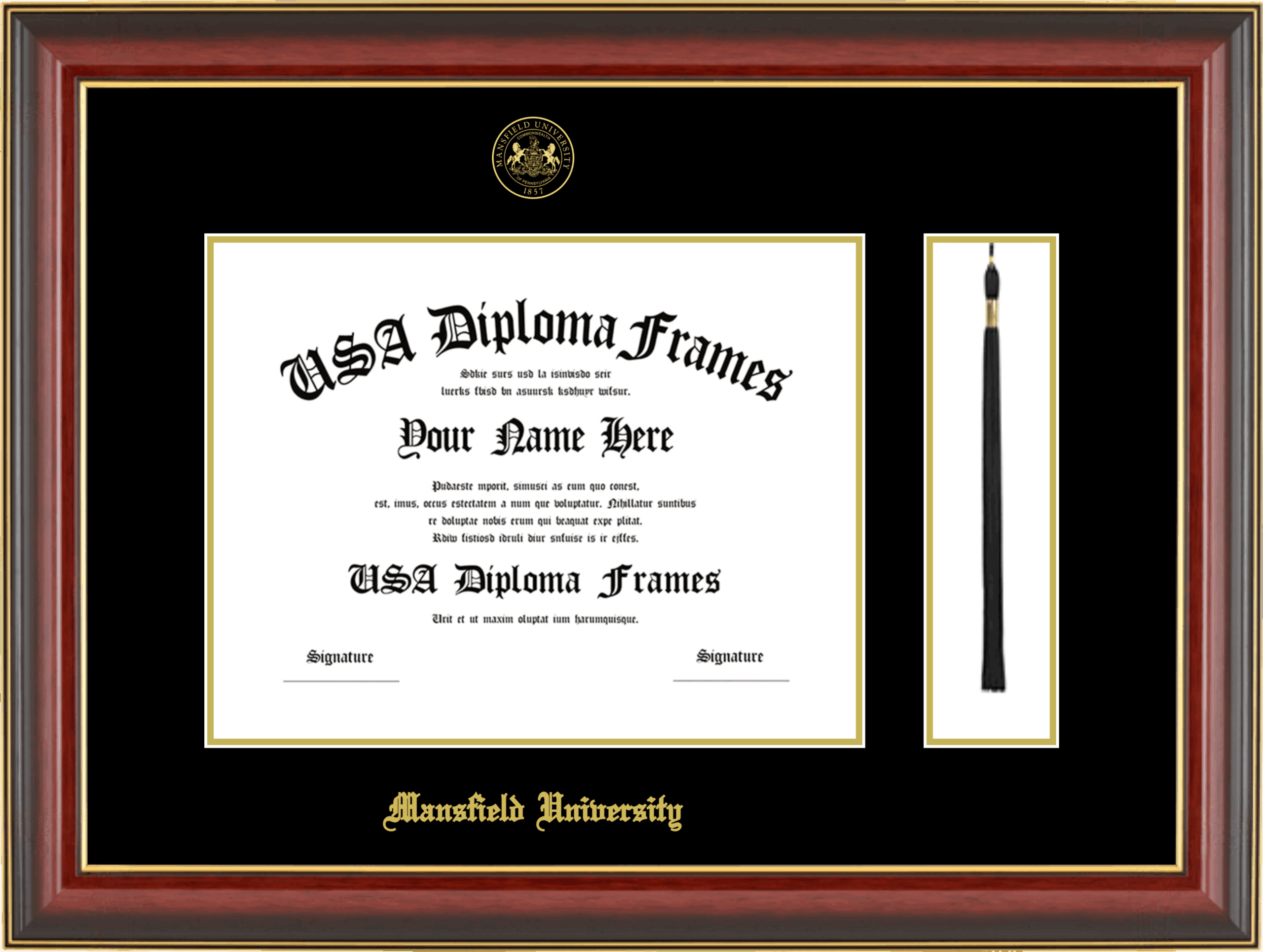Mansfield University – Single Horizontal Document ( Diploma ) – Cherry Mahogany Gold Trim Glossy – Black Mat – Gold Accent Mat – With Tassel(Default) – With Seal(University Seal Gold) – With Gold Embossing (Mansfield University)