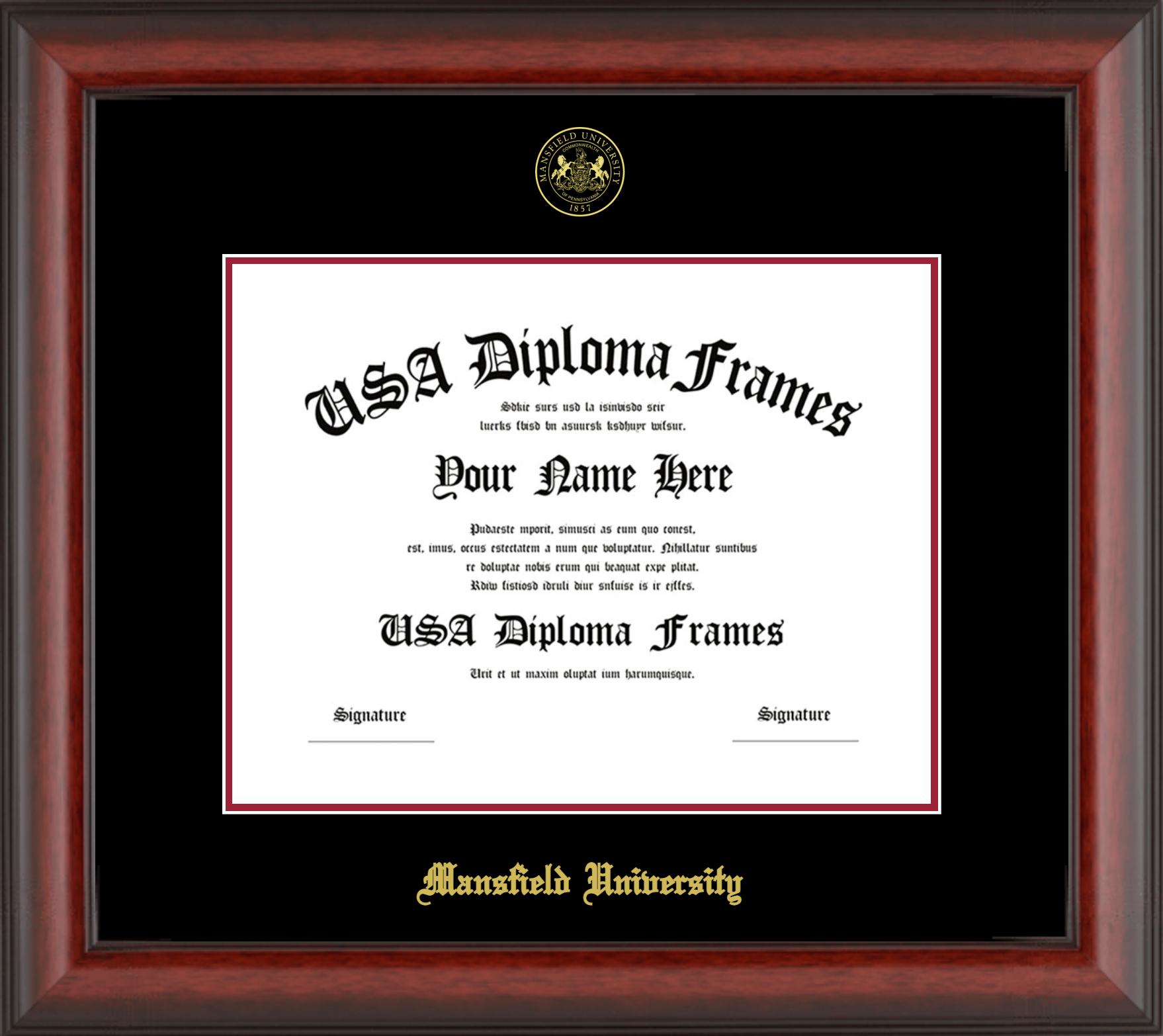 Mansfield University – Single Horizontal Document ( Diploma ) – Cherry Mahogany Matte – Black Mat – Crimson Accent Mat – With Seal(University Seal Gold) – With Gold Embossing (Mansfield University)