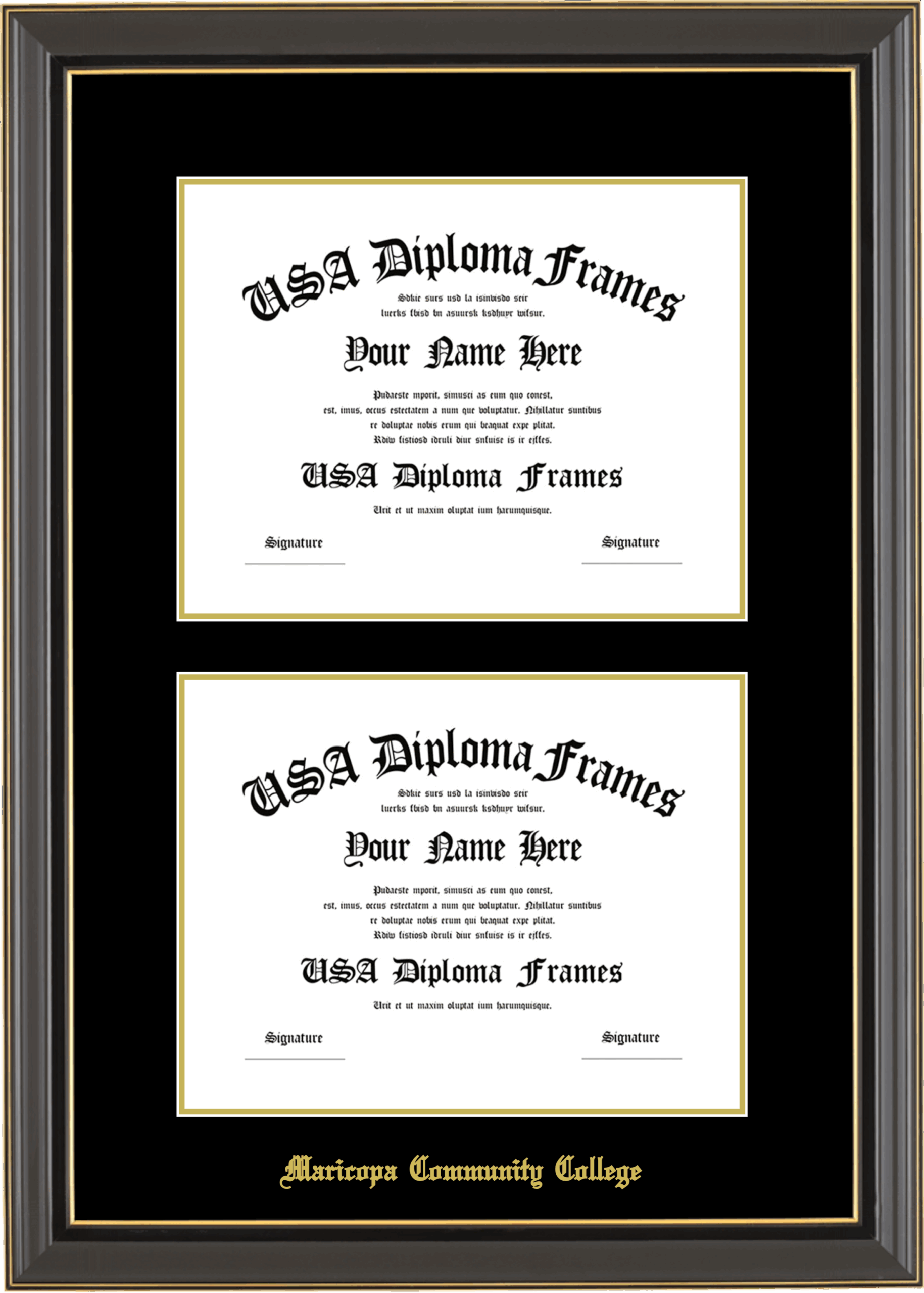 Maricopa Community College Double Diploma Frame – Double Document – Black Gold Trim Glossy – Black and Gold Mat