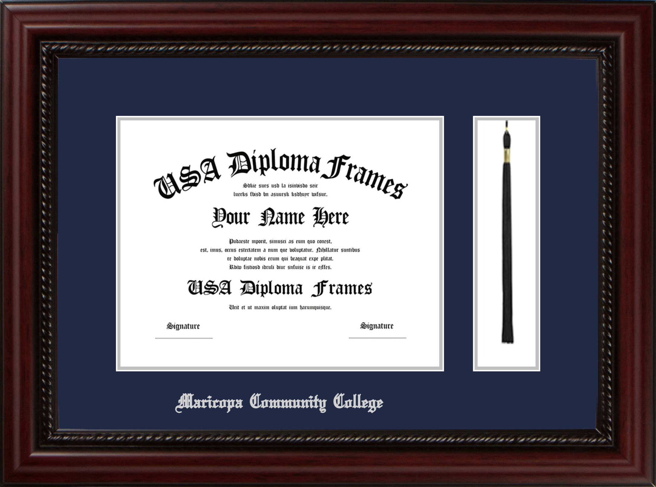 Maricopa County Community College District – Single Horizontal Document ( 8 1/2″x11″ ) – Executive Cherry Rope – Navy Mat – Silver Accent Mat – With Tassel(Default) – With Silver Embossing (Maricopa Community College)