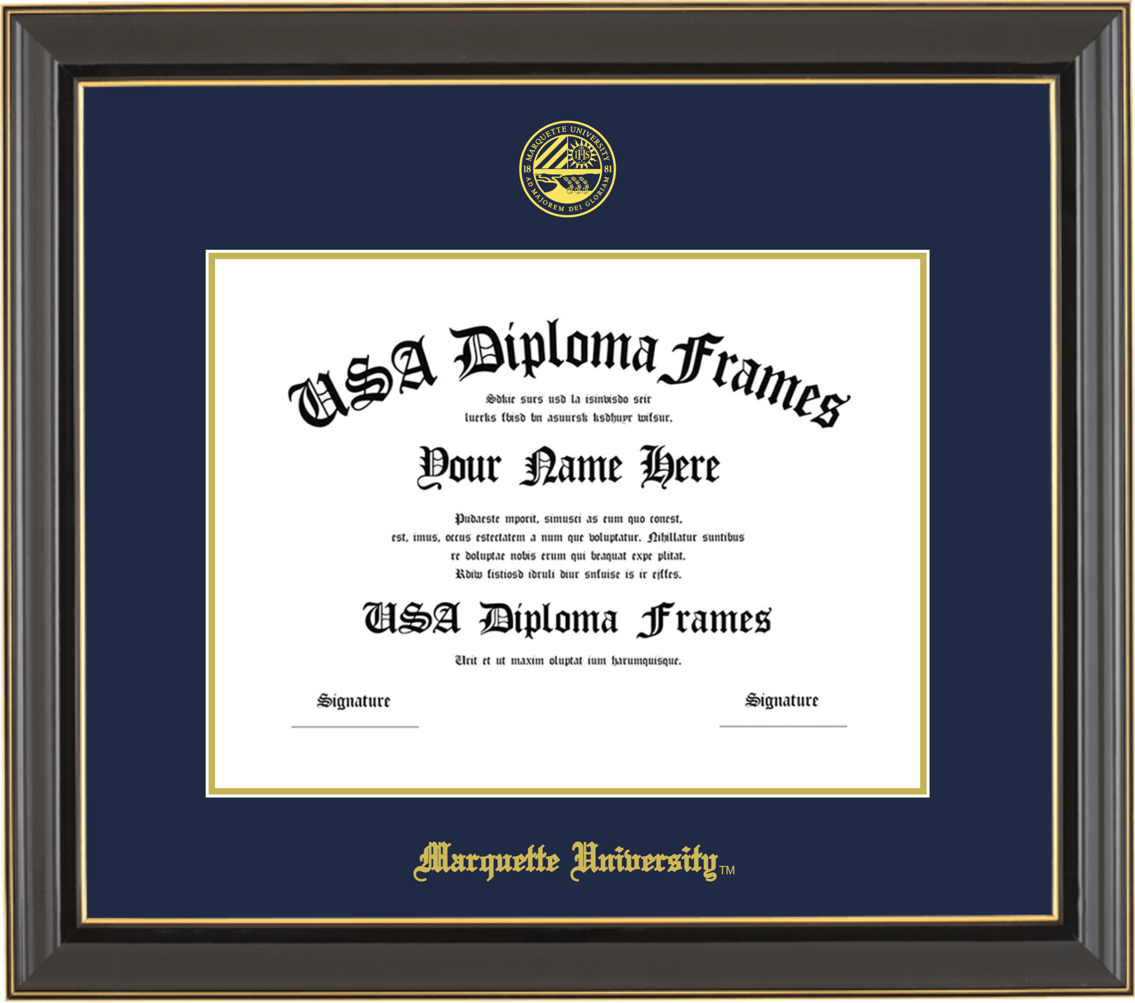 Marquette University – Single Horizontal Document ( Diploma ) – Black Gold Trim Glossy – Navy Mat – Gold Accent Mat – With Seal(University Seal Gold) – With Gold Embossing (Marquette University)
