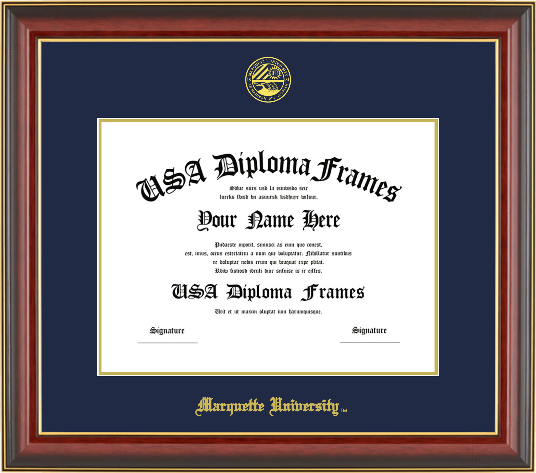 Marquette University Diploma Frame – Cherry Mahogany Gold Trim Glossy – Navy and Gold Mat