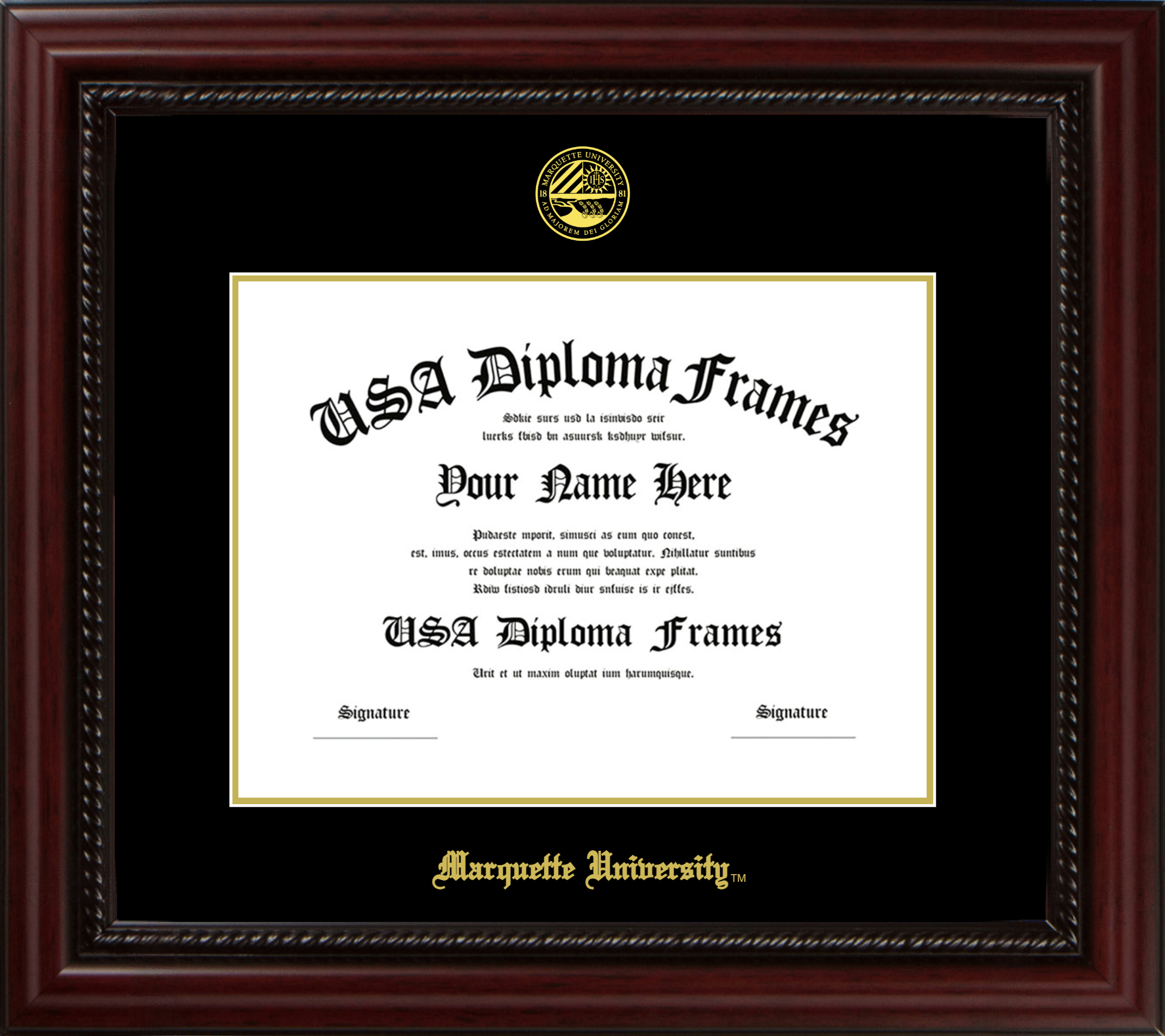 Marquette University Diploma Frame – Executive Cherry Rope – Black and Gold Mat