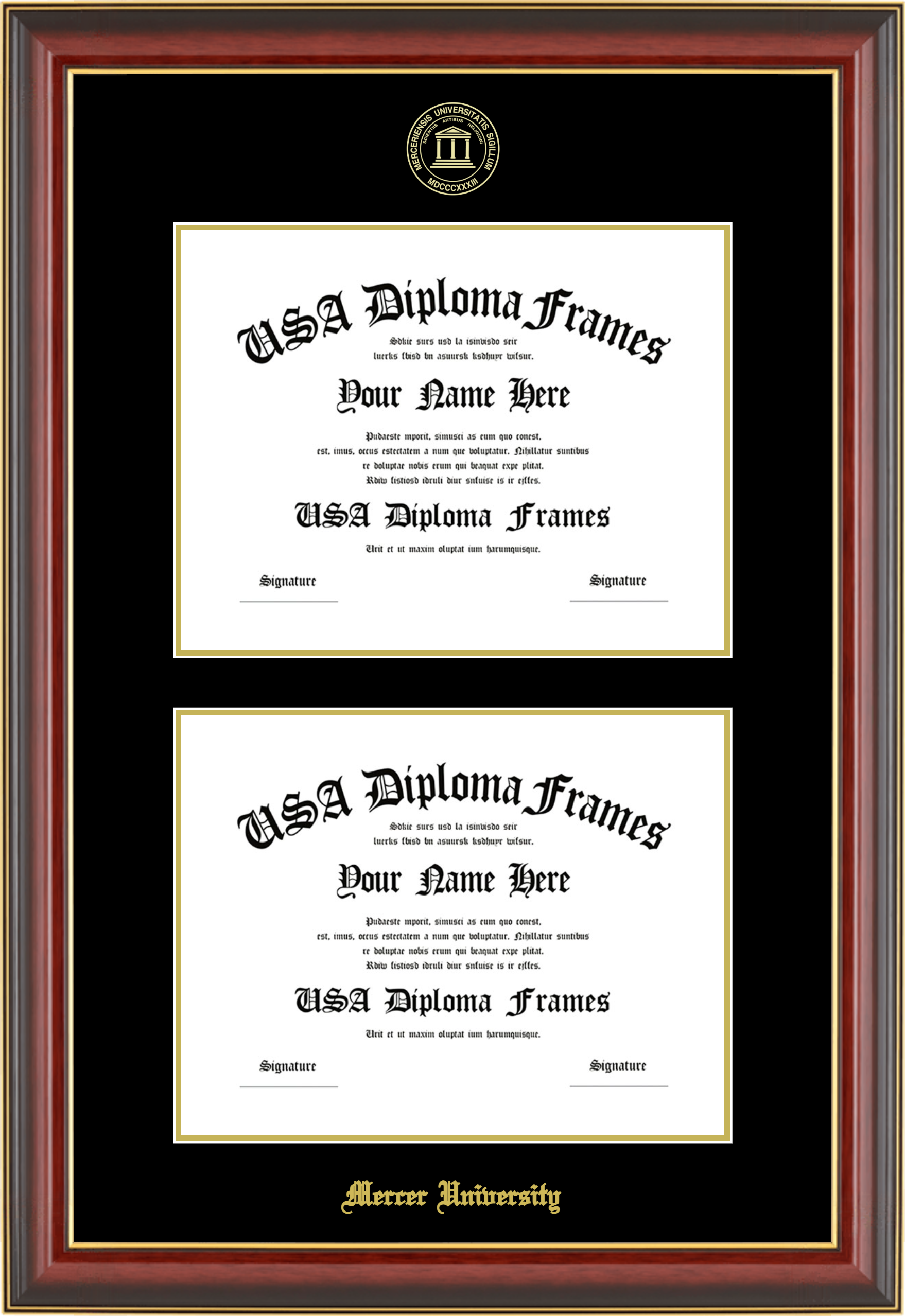 Mercer University Double Diploma Frame – Double Document – Cherry Mahogany Gold Trim Glossy – Black and Gold Mat