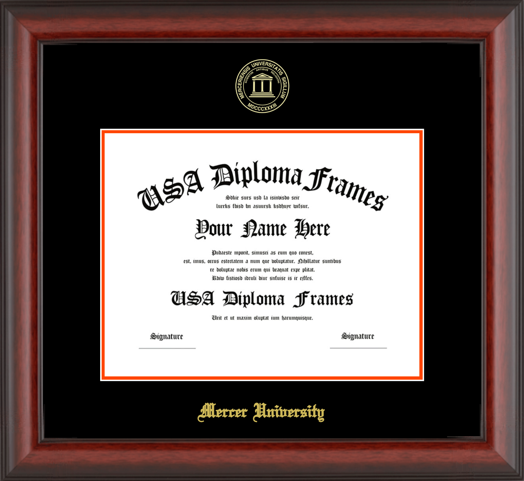 Mercer University Diploma Frame – Cherry Mahogany Matte – Black and Orange Mat
