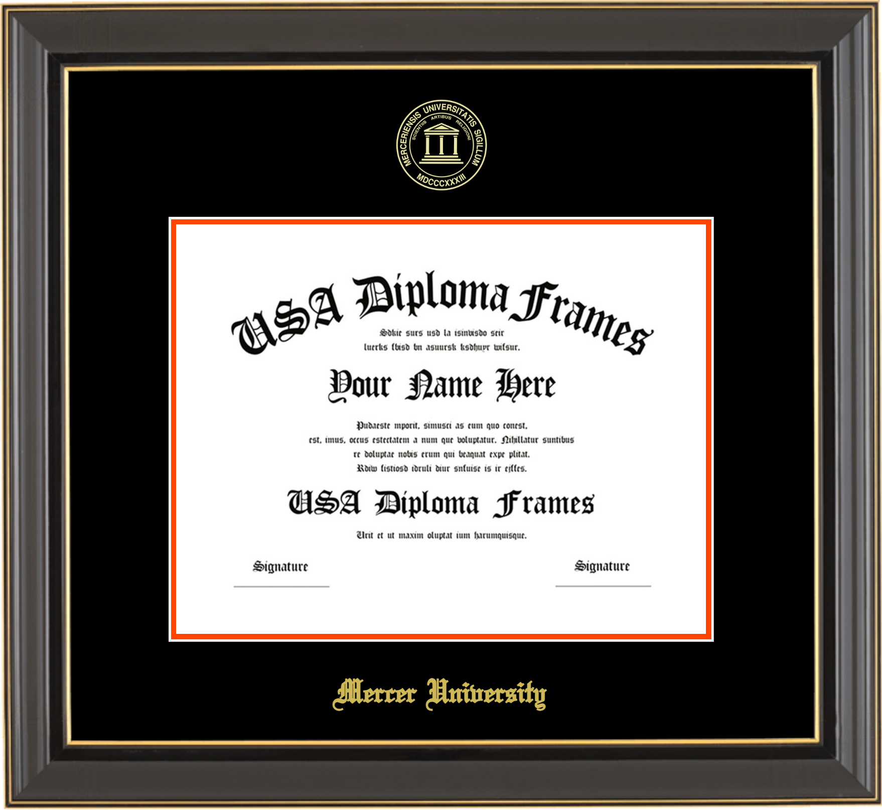 Mercer University – Single Horizontal Document ( Bachelors/Masters ) – Black Gold Trim Glossy – Black Mat – Orange Accent Mat – With Seal(University Seal Gold) – With Gold Embossing (Mercer University)